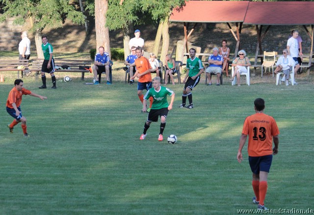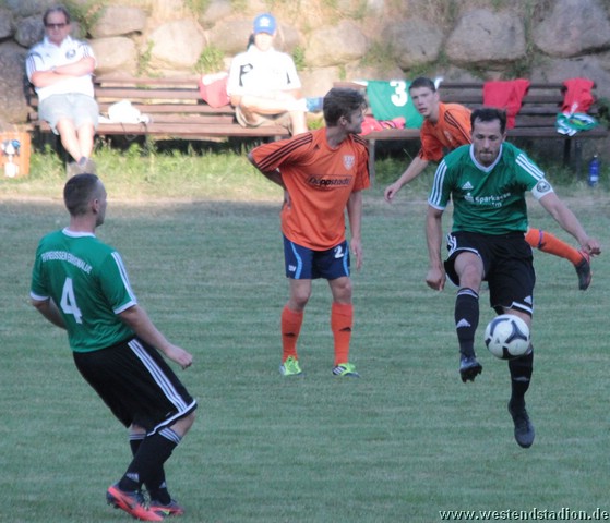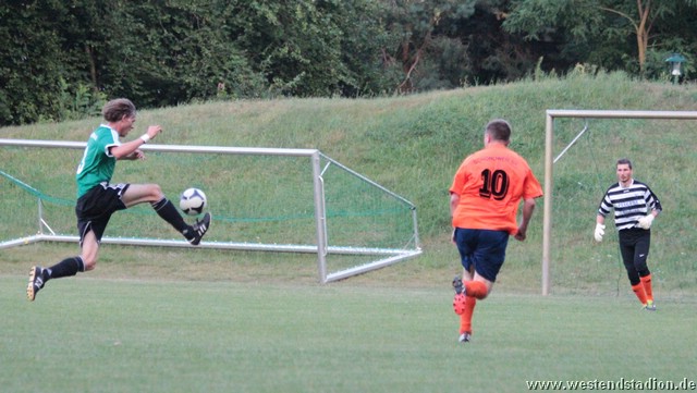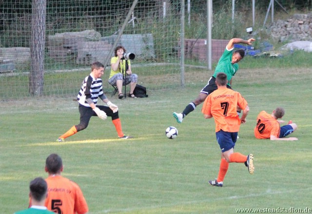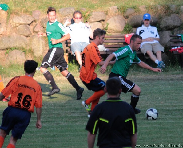 Im gesammten Spiel erlaubte man der, von Marcel Urbanowicz trainierten Heimmannschaft keine richtige Torchance, stand in der Defensive sicher. Nach vorne wurde zwar kein Feuerwerk abgebrannt, aber die Chancen ergaben sich immer wieder. Sebastian Schmidt und Tobias Koepnick hätten Preussen in Führung bringen können, das gelang dann Eric Mba in der 29.Minute. Preussen weiter klar spielbestimmend legte vor der Pause durch einen Heber von Rico Musick noch nach. Zahlreiche Wechsel zur Pause sollten jeden mal zum Zuge kommen lassen. Allerdings ergab sich schon gleich nach Wiederanpfiff ein weiterer nicht geplanter Austausch. Denn Eric Mba war frei durch und wurde vom Torwart im Strafraum erwischt und konnte so nicht abschliessen. Leider musste er danach verletzt das Spielfeld verlassen, den Elfmeter verwandelte Felix Kalohn sicher. Durch die Änderung in der Sturmspitze war dann für eine Weile die Luft raus und es passierte weniger. Schönow hielt besser dagegen, kam aber außer ein Paar Flanken ohne Wirkung nicht in den Strafraum. In der Schlussphase hätten Taku Hishida und Marcel Hellmich mit Szenen frei vor dem Tor noch das Ergebniss erhöhen können verfehlten aber jeweils aus 5 Metern die Kiste. Auch wenn der Trainingsstand und die Liga beider Teams auseinder liegen, zeigte man doch eine überzeugende Leistung und geht nun am Wochenende ins Trainingslager nach Malchow.