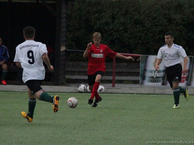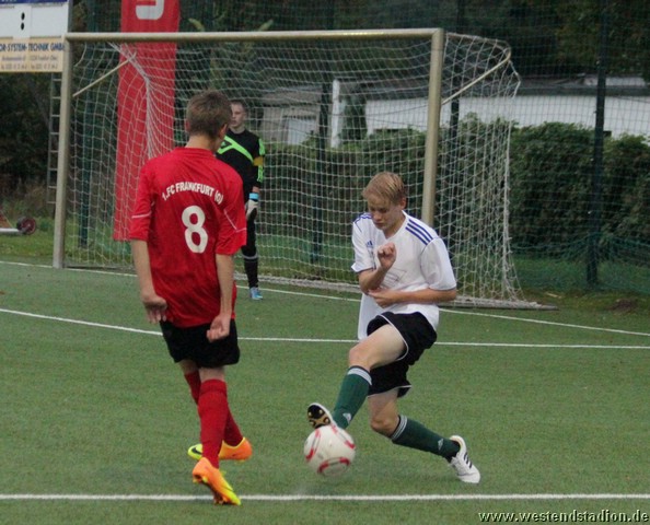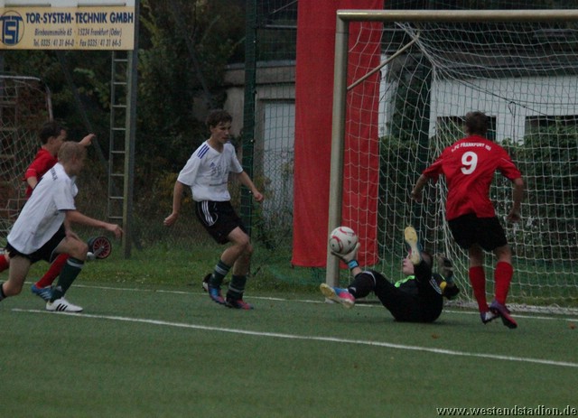 Der erst Angriff brachte dann auch gleich die Führung der Heimmannschaft, ein Spieler kann sich zentral durchdribbeln, auch wenn der Pass den er noch ablegt abseitsverdächtig aussah war das natürlich ein klarer Abwehrfehler. So schien es weiter zu gehen, in der 6.Minute wird nach einem verlängerten Eckball ein Stürmer am langen Pfosten nicht konsequent gedeckt und köpft zum zweiten Treffer ein. Längere Zeit entwickelt sich ein Spiel auf ein Tor, bei dem Manuel Rauh mit starken Parade ein frühes Debakel verhindert. Erst nach einer halben Stunde werden die wenigen Vorstösse der Eberswalder etwas effektiver, aber mehr als zwei harmlose Fernschüsse kommen nicht an, dennoch ist der Einsatz in der Defensive jetzt intensiver, so das auch Frankfurt nicht mehr so nach ans Tor ran kommt. In der zweiten Halbzeit ist man schnell mit 0-3 in Rückstand, als nach einem Konter den läuferisch überlegenen Frankfurtern zu viel Platz gelassen wird. Danach schafft man aber durch eine deutliche Steigerung wieder die Räume einzuengen und seinerseits einige Akzente nach vorne zu setzen. Die Frankfurter werden schon vor dem Strafraum besser angegriffen und geben immer Häufiger die Bälle ab, so gab es nur noch wenige Strafraumszenen. Vor allem Hannes Drews holte immer wieder unermüdlich Bälle zurück. Drei Minuten vor Schluss hat man dann aber Pech als eine Flanke ohne vom Stürmer im Strafraum noch berührt zu werden an den Innenpfosten und ins Tor geht. In einer Trotzreaktion wird noch mal alles nach vorne geworfen und so gelingt nach einer Freistossflanke von Phillip Keller lang und hoch nach vorne noch der verdiente Ehrentreffer durch Robert Schmidt.