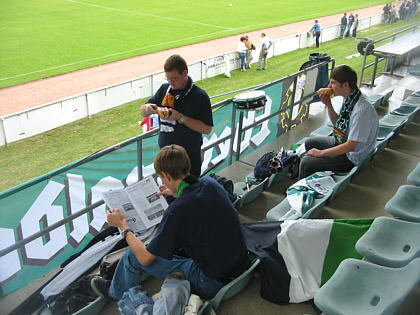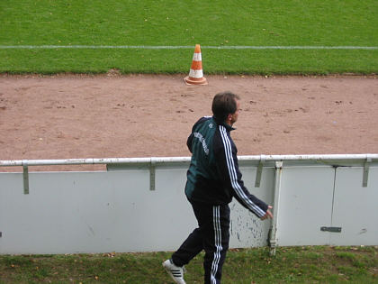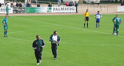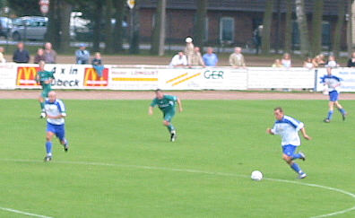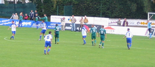 Motor tauchte nur gelegentlich mal vorne auf, André Germer und Martin Falk blieben jedoch zumeist an der Grundlinie hängen. Umstritten dann die Führung für Schönberg. Bei einem halbhohen Pass in den Strafraum hob der Linienrichter die Fahne um Abseits anzuzeigen, der Stürmer versuchte weiter aufs Tor zu laufen, wobei ihn der herausstürzende Olaf Pospiesny zu Fall brachte. Der Schiri zeigte unter Ignorierung seines Assistenten auf den Elfmeterpunkt und liess sich auch nach Konsultation dessen nicht umstimmen. Wittfot verwandelte den Strafstoß sicher. Danach war Motor die nächsten Minuten der Schock über den Rückstand deutlich anzumerken. Schönberg fehlte es lediglich im letzten Abschluss um das Ergebnis zu erhöhen. Dennoch gelang ihnen das 2:0, in der Entstehung reichlich kurios. Ein Kopfball flog als Bogenlampe gegen den Pfosten. Olaf Pospiesny , der sich auf den Ball werfen wollte liess diesen jedoch wieder los, aus dem Gewühl traf dann Kollmorgen für Schönberg. Nun war Motor natürlich gefordert das Risiko zu erhöhen, wollten sie hier nicht noch vorgeführt werden. Einen leichten Umschwung brachte dann völlig unnötige Hektik, die nach einer Reihe kleinerer Fouls aufkam und mehrerer zweifelhafter Entscheidungen des Unparteiischen, der beide Teams reichlich mit gelben Karten 'versorgte'. Unmittelbar vor der Pause eskalierte dies dann noch in einem Wortgefecht zwischen dem Linienrichter und Motor Trainer Pröger, der ihm einen Verweis auf die Tribüne einbrachte. Nun meldete sich auch Motor im Spielgeschehen deutlich zurück, so hatte Rafet Ates eine Kopfballchance die jedoch am Tor vorbei ging und der aufgerückte Torsten Maerz verzog einen Volleyschuss aus Nahdistanz der eigentlich ein Tor hätte sein müssen.