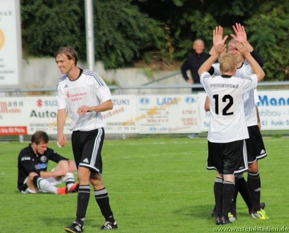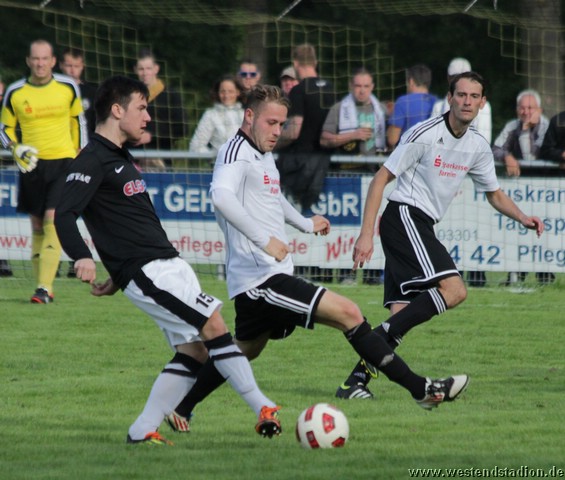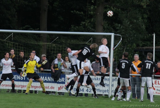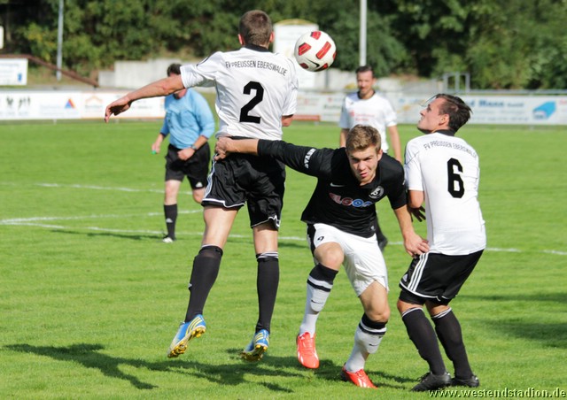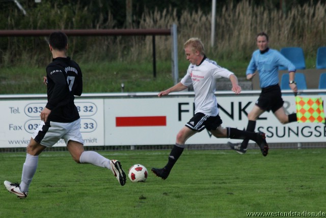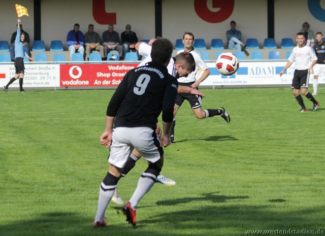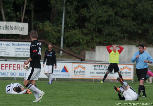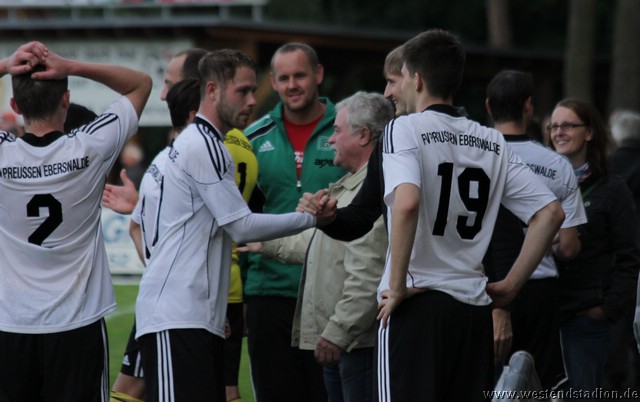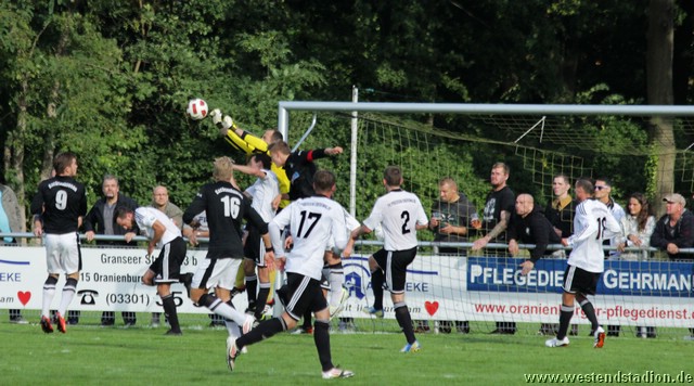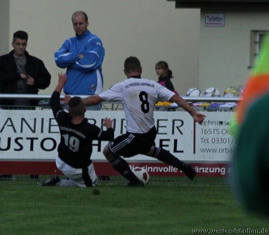 Stark umgestellt und mit Rückkehrer Kristian Stelse in der Innenverteidigung, dafür Nils Naujoks offensiv im Mittelfeld aufgeboten präsentierte sich Preussen mit Präsenz in den Zweikämpfen und lies der Heimmannschaft wenig Platz für weiträumige Spielzüge. Dafür wurde nach Balleroberung schnell nach vorne gespielt. Das verschaffte bald auch die ersten Torchancen. Nils Naujoks war auf der linken Seite plötzlich durch und hatte die Möglichkeit abzuziehen, legte aber quer und so konnte der Ball geklärt werden. Eine ähnliche Gelegenheit hatte Rico Musick wenig später, seit Schuss verfehlte aber das kurze Toreck. Sachsenhausen lauerte auf Unsicherheiten in der Eberswalder Defensive, die zum Glück selten blieben. Dennoch standen die Hausherren bei zwei Situationen nahe am Führungstreffer, einmal parierte Swen Lichtenberg den Flachschuss des frei durchlaufenden A.Müller , dann wurde ein Schuss von der Strafraumgrenze haarscharf zur Ecke abgelenkt. Insgesamt war die erste Halbzeit von den Spielanteile ausgeglichen was bei der Ausgangslage für die Eberswalder sprach. In die zweite Halbzeit startete Sachsenhausen mit einer Druckphase bei der immer wieder die großen Stürmer mit langen Bällen gesucht wurden. Mitten hinein dann aber eine glasklare Konterchance für Tobias Koepnick, der frei durch war aber den Ball knapp rechts neben das Tor schoss. Nun blieb Preussen aber dran, erkämpfte sich viele Bälle im Mittelfeld und baute selber Druck auf. Nach weiteren kleineren Gelegenheiten ist Nils Naujoks auf der rechten Seite seinem Bewacher enteilt und macht mit einem Flachschuss ins lange Eck die Führung. Sachsenhausen danach zwar mit mehr Druck nach vorne aber durch das weite Aufrücken auch sehr konteranfällig. Die Preussen mit der Möglichkeit zur Vorentscheidung als der eingewechselte Felix Kalohn frei durch ist aber knapp links neben das Tor schiesst. So kommt es zur dramatischen Schlussphase in der Sachsenhausen vor allem nach mehreren Eckbällen noch mal vors Tor kommt. Aber die Bälle können allesamt geklärt werden. Am Ende spielt Preussen die Konter auch nicht mehr konsequent aus, holt so aber die Zeit raus das Ergebnis über die Runden zu bringen. Ein überraschender aber verdienter Auswärtssieg, der wieder Selbsvertrauen geben sollte.