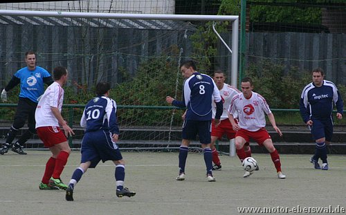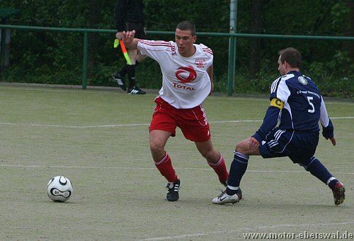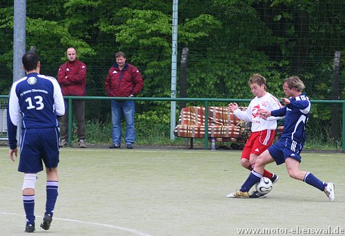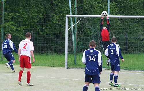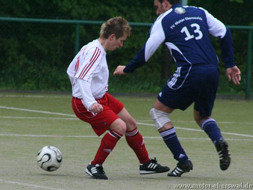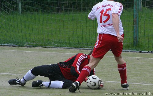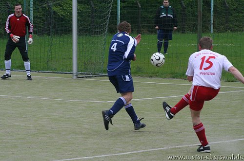Zwar gab es im Duell feststehender Absteiger gegen feststehender Aufsteiger die zu erwartenden klaren Verhältnisse, das Ergebnis blieb aber diesmal erträglich. Motor II geriet gleich beim ersten Prenzlauer Angriff in Rückstand, eine hohe Flanke ins Gewühl vor dem Tor und ein Abstauber wurde verwandelt. Danach Prenzlau weiter mit Schwung, lies aber zwei glasklare Chancen aus. Doch in der 12.Minute war ex-Motor Spieler Persecke zum 2:0 zur Stelle. Nachdem ein Prenzlauer Spieler an der eigenen Strafraumgrenze umgeknickt war und ausgewechselt werden musste, schalteten die Gäste deutlich einen Gang zurück. Zeitweise schien das Spiel zu stehen. Denn die Prenzlauer schoben sich 'hinten rum' den Ball zu und Motor II stand tief und schaute zu. In der 25.Minute schnappte sich Kevin Banaskiewicz den Ball an der Mittellinie und zog alleine auf die Verteidigung zu. Vermutlich war er selber überrascht, das er gleich zwei Mann stehen lies, denn der Abschluss war dann zu ungenau. Ansonsten passierte bis kurz vor der Pause relativ wenig. Erst dann machten die Prenzlauer erst mit einem Konter zwei auf eins und dann mit Alleingang (2x Persecke) den 4:0 Pausenstand. Im zweiten Abschnitt schien es dann wieder so deutlich zu werden wie im Hinspiel, denn schon wenige Minuten nach Wiederanpfiff bekam Prenzlau einen Elfmeter den Persecke verwandelte. Aber Prenzlau zog dann doch nicht nochmal an. Stattdessen versuchten sie es nur noch mit langen Bällen auf die beiden Stürmer, die ein ums andere mal ins Abseits tappten. Stefan Silz und Michael Prost gingen jetzt auf das Prenzlauer Mittelfeldspiel konsequenter drauf und konnten sich immer öfter Bälle erbern, so das auch die Eberswalder zu Angriffen kamen. Als einem Prenzlauer im Strafraum der Ball an den ausgestreckten Arm sprang, gab es Elmeter für Motor II, den verwandelte Andreas Sasse sicher. Überhaupt sah es danach garnicht mehr so einseitig aus. Zwar vergab Prenzlau noch zwei richtig große Chancen, weil Michael Mieseler glänzend parierte, aber der Dauerdruck den sie zweitweise gemacht hatten war weg. Nach einem Freistoss von Michael Prost, konnte Kevin Banaskiewicz den Abpraller aus Nahdistanz in die kurze Torecke verwandeln. Penzlau zog, immernoch nach dem gleichen Muster seine Angriffe auf, auf die sich Motor aber inzwischen eingestellt hatte. Gefährlicher wurden Einzelaktionen durch die Mitte, hier reagierte erneut Micheal Mieseler stark , ein anderes mal wurde ganz knapp links vorbei geschossen. Das Endergebnis kam dann erst in der letzten Aktion des Spiels zu stande. Diesmal fand eine Flanke von der Grundlinie seinen Abnehmer, erneut Johannes Persecke, der volley aus fünf Metern traf.