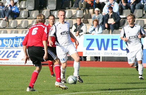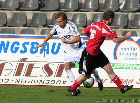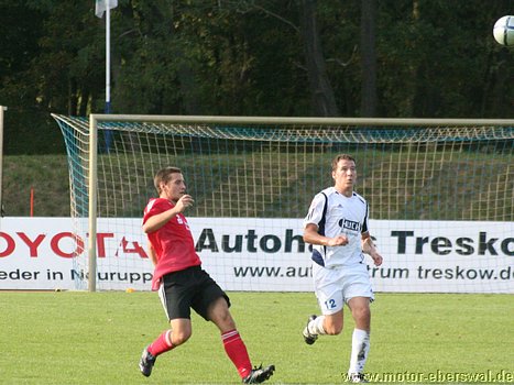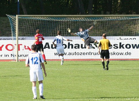 In die Abwehr waren mit Martin Falk und Patrick Turowski zwei Spieler aus der Landesligamannschaft gerückt, während Felix Kalohn Libero für den gesperrten Kristian Stelse spielte. In Spiel übernahm Neuruppin schnell die aktivere Rolle, wenn auch Motor die erste Torchance besass, aber Rafet Ates schloss einen Kontr aus guter Position zu spät ab und verfehlte das Tor deutlich, danach spielte nur noch Neuruppin und hatte bei gleich fünf Großchancen keinen Erfolg. Das vor allem weil Motor Torwart Olaf Pospieszny mit mehreren Glanzparaden den Rückstand verhinderte und bei zwei Lattenschüssen des Glaück auf seiner Seite hatte. Motor meldete sich erst kurz vor der Pause noch einmal, als Christian Schlegel frei auf das Tor zulaufen konnte, aber noch beim Schuss von einem Abwehrspieler gestört wurde und so knapp neben den Kasten zielte. Die zweite Halbzeit war vom Tempo her deutlich langsamer als die erste Hälfte, Motor beschränkte sich auch weiterhin nur auf die Verteidigung und konnte in der Offensive überhaupt nichts mehr bewegen. Neuruppin gelang, obwohl ebenfalls nachlassend die Führung. Als ein Drehschuss von Eggert vom Innepfosten die Torlinie überschritt. Danach versuchte Motor zwar mit aufgeückter Abwehr etwas Druck aufzubauen, jedoch fanden die hoch hineingeschlagenen Flanken zumeist keinen Abnehmer. Auch die Neuruppiner Konter wurden nur halbherzig gespielt, wobei Neuruppin mit zwei Distanzschüssen bis zum Schluss noch für mehr Torgefahr sorgte als die Eberswalder.