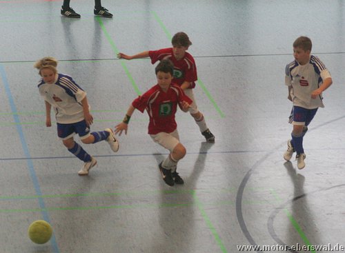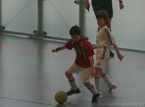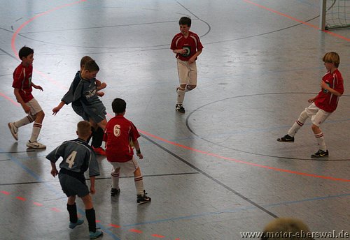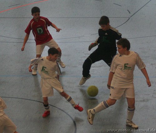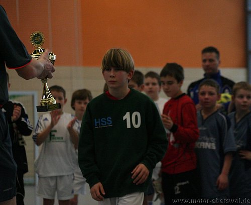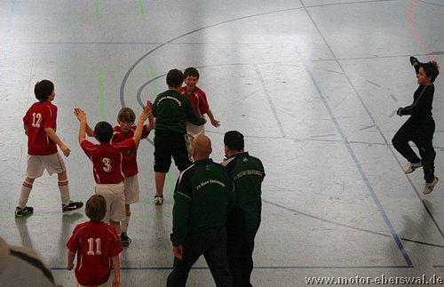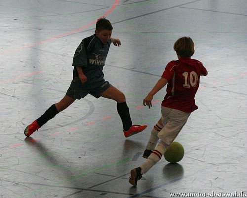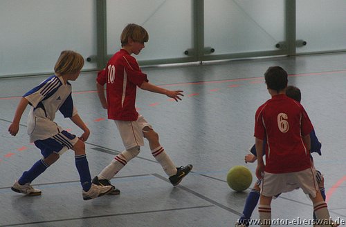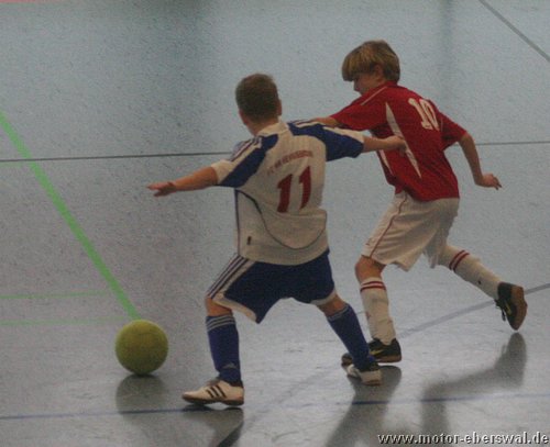 Die E-Junioren gewinnen den Eberswalder Hallencup im Sportzentum Westend und stellen mit Lucas Schmidt den besten Torschützen des Turniers. Die Mischung des Turnierfeldes sah diesmal die Barnimer Mannschaften von Basdorf, Zepernick, Rüdnitz/Lobetal, Hennigsdorf und Petershagen aus der Region, die zwei Eberswalde Teams von Lok und Motor. Den weitesten Weg hatte der SC Schwerin aus der Mecklenburger Landeshauptstadt. Im ersten Spiel gegen Rüdnitz lies Motor nichts anbrennen und gewann souverän mit 6:1, was man auch im zweiten Spiel gegen Petershagen/Eggersdorf mit einem 3:0 Sieg bestätigte. Da einem danach der Gruppensieg nicht mehr zu nehmen war, wurde gegen Hennigsdorf etwas der Gang raus genommen und es langte nach Führung nur zu einem 1:1, was aber dennoch den Gruppensieg bedeutete. Im Halbfinale gegen Basdorf war man dann wieder drückend überlegen und lies den Gegner kaum aus seiner Hälfte. Obwohl die Chancen nicht mal optimal genutzt wurden machte man bis zum Schlusspfiff das halbe Dutzend voll. So steuerte man auf das zu erwartende Finale gegen Schwerin hin, die ihre Gruppe ebenfalls beherrscht hatten und im Halbfinale gegen Hennigsdorf mit 5:0 keine Fragen offen liessen. Trotz spielerischer Vorteile der Schweriner zu Beginn, ging Motor durch Lukas Schmidt in Führung, die aber postwendend ausgeglichen wurde. Motor spielte auf Konter und spekulierte auf die weiten Ausritte des Schweriner Torwarts, der sich bei einem Konter von Lucas Schmidt überrascht werden konnte. Nach der Eberswalder Führung machte Schwerin Druck und durch ein Eigentor gelang den Mecklenburgern der erneute Ausgleich. Motor spielte aber unbeeindruckt weiter und aus fast identischer Position wie bei zweiten Treffer machte Lucas Schmidt 80 Sekunden vor Schluss den Dreierpack perfekt. Danach wurde das Spiel mit Geschick über die Zeit gebracht und am Ende verdient gewonnen. Das kurzfristig wegen der vielen Spielausfälle organisierte Turnier erwies sich so als Erfolgserlebnis vor der Rückrunde und machte allen Beteiligten nochmal richtig Spass.