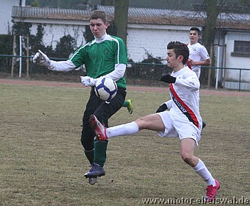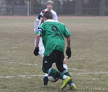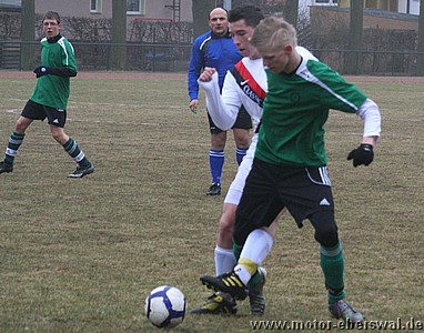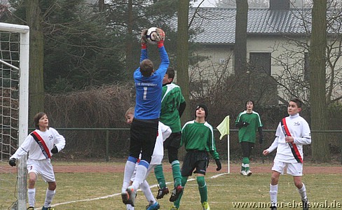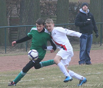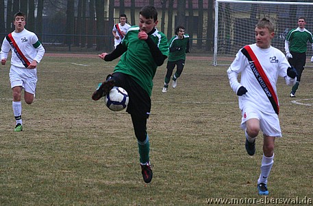 Die C-Junioren verlieren in Hennigsdorf mit 0:2. Trotz einiger Ausfälle hätte man in der ersten Hälfte des Spiels in Führung gehen müssen, aber zunächst Paul Schuster mit einem Alleingang (12.min) und vor allem Eric Krause , der nach einem Zuspiel vor dem leeren Tor verstolperte (30.) liessen die besten Chancen aus. Hennigsdorf spielte schnörkelloser und kam so besser mit den Bodenbedingungen zurecht. Der Führungstreffer fiel nach einer Ecke, bei der Jan Smolka -heute als Torwart aufgeboten- zunächst mit einer Hand hielt, aber gegen den Kopfballabstauber machtlos war (35.). In der zweiten Hälfte hätte Hennigsdorf mit zwei Hundertprozentigen Chancen gleich zu Beginn das Spiel entscheiden können, aber es wurde nach einer Ecke aus zwei Metern drüber geschossen. Fünf Minuten später wurde nach einem Alleingang der Ball neben das Tor geschoben. So blieb es bis in die Schlussphase spannend. Zwei Angriffe von Nick Lange und Paul Schuster wurden abgepfiffen. Motor konnte das Tempo bis in die Schlussphase nicht halten und so ergaben sich nach dem Aufrücken des bis dahin fehlerlosen Liberos Domenick Adam die größeren Konterchancen auf der anderen Seite. Unmittelbar vor dem Schlusspfiff konnte Marius Aplas den stürmer nicht entscheidend stören, Jan Smolka lenkte den Ball zwar noch ab, aber er landete dennoch im Tor. Der Vorsprung in der Tabelle ist mit dem Punktverlust erstmal wieder verloren, es wird wohl in den direkten Vergleichen mit Velten und Seelow (beide zu Hause) darauf ankommen, ob man am Ende wieder oben steht.