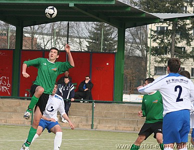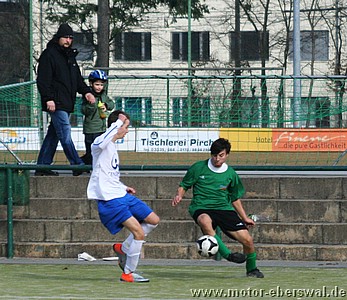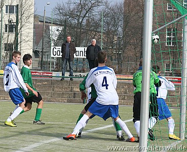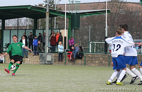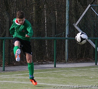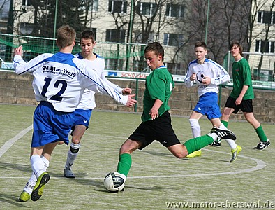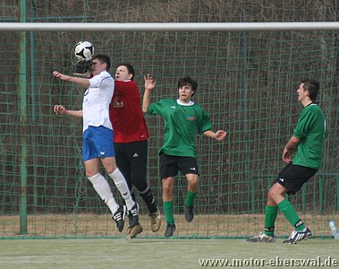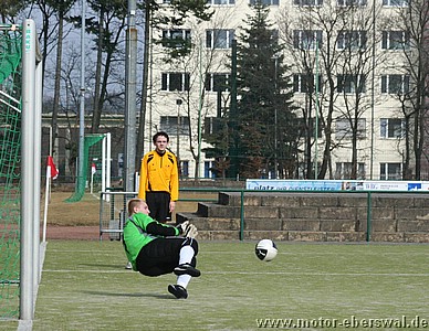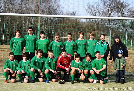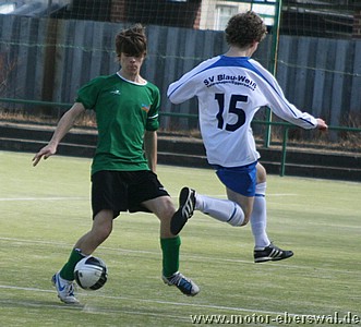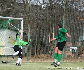 Mit einem nie gefährdeten 8:0 Sieg führt die B-Junioren Spielgemeinschaft weiter die Tabelle an. Gegen Petershagen-Eggersdorf kam nach einigen, von Gästeseite stark kritisierten Schiedsrichterentscheidungen früh Agressivität ins Spiel, was sich allerdings aufs Spieltempo positiv auswirkte und den Eberswaldern zu gute kam. Denn diese übernahmen sofort das Kommando und konnten durch frühes Pressing die Gäste ständig unter Druck setzen. Philip Kojan gelang galng nach Flanke von Kenny Ladewig die schnelle Führung, die durch eine direkt verwandelte Ecke drei Minuten später noch ausgebaut wurde. Hektisch wurde es zwar auch ab und zu, die Eberswalder liessen sich aber nicht provozieren und setzten weiter ihr offensives Spiel um. Die Gäste kamen nur selten bis an den Strafraum. Bis auf eine per Kopf geklärte Situation stand die Lo/Mo Abwehr vor keinerlei Problemen. Vorne konnte nach einigen vergebenen Chancen durch einen platzierten Distanzschuss von Philip Kojan wieder nachgelegt werden. Eine sehr ungeschickte Abwehraktion wurde mit Strafstoß geahndet, den Philip Heinrich mit Hilfe der Lattenunterkante verwandelte. Dazu hatte er eine Minute vor der Halbzeit nochmals die Gelegenheit und erneut brachte er den Ball im Tor unter. Der Gegner schien unmittelbar nach der Pause erstmals präsenter zu werden und hatte nach zwei Flankenläufen die ersten Ansätze zu Torchancen, auch wenn zwingender Abschluss fehlte. Die Eberswalder waren dadurch aber nicht zu beeindrucken und antworteten mit einem Doppelschlag. Erst zirkelte Philip Heinrich einen Freistoss aus zwanzig Metern genau in den Winkel und im nächsten Angriff verwertete Kenny Ladewig eine Hereingabe von Links zum siebenten Treffer. Einen Vorstoß durch die Mitte aufs Tor schloss Philip Kojan in der 55.Minute humorlos mit einem platzerten Heber zum 8:0 ab. Erst in den letzten zwanzig Minuten nahm man etwas den Gang raus und eröffnete dem Gegener zwei echte Torchancen. Diese verpassten den Ehrentreffer aus Nahdistanz, da der Ball noch von der Linie gekratzt werden konnte. Zwei weitere Chancen von der Strafraumgrenze waren kein Problem für den gut stehenden Keeper. Hitzig wurde es noch in den letzten Minuten, als nach unnötigen Fouls noch zwei Verwarnungen ins Spiel kamen. Einen weiteren Strafstoss für Eberswalde konnte der Gästekeeper parieren. Auch so eine starke Leistung, die die Ausgangsposition vor dem Duell bei Verfolger Frankfurt/O II weiter verbessert.