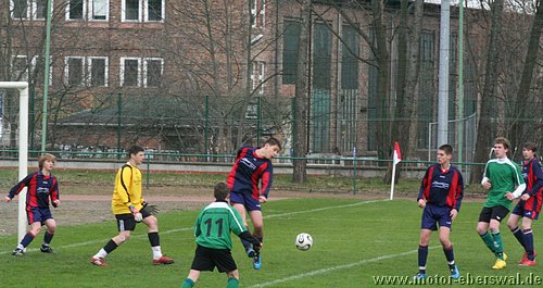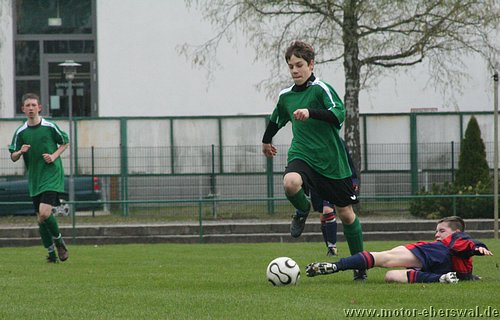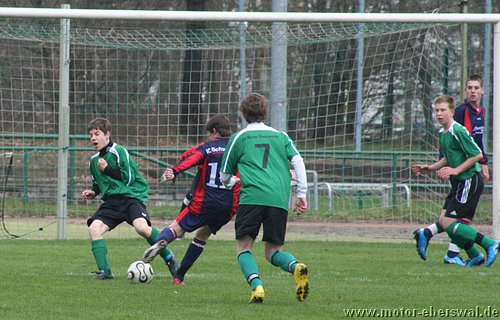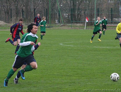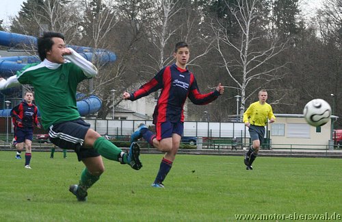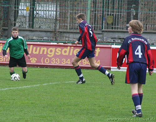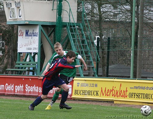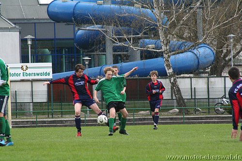 Naturrasen ist in dieser Saison nicht der Freund der C-Junioren, vor allem wenn das Geläuf etwas tiefer und der Ball langsamer ist, fällt es eben mit dem 'Ballzauber' schwerer als auf dem Kunstrasenplatz. So verwunderte es nicht das gegen Schwedt zunächst nur schnelle Läufe über die Flanken von Paul Schuster und Tjen Jang zu Torchancen führten. Diese konten allerdings trotz behertzer Abschlüsse von Marius Aplas und Kenny Ladewig nicht genutzt werden. Schwedt war bei seinen Vorstössen gefährlich und scheiterte zweimal an Paraden von Marcus Landsrath. Dennoch gelang den Gästen die Führung nach einer Ecke. In der zweiten Halbzeit hatten die Aktionen der Eberswalder dann deutlich mehr Zug zum Tor und es galng Schwedt deutlicher unter Druck zu setzten. Dennoch verfehlten die Flanken und Eingaben meist die besser postierten Spitzen und es wurde im letzten Moment einfach zu viel 'getrixt' statt einfach mal abzuziehen. Schwedt nur noch durch Konter präsent aber auch immer mehr hinten rein gedrängt. Chancen von Nick Lange , Paul Schuster und Domenick Adam verfehlten das Tor knapp. Der Ausgleich dann erst 10 Minuten vor Schluss, als Nick Lange frei zum Tor durch war und durch ein Foul gestoppt wurde. Den fälligen Elfmeter verwandelte Domenick Adam. Dennoch hätte das Spiel noch verloren gehen können, denn Schwedt hatte drei Minuten später einen Konter im Alleingang. Aber Marcus Landsrath konnte sowohl den Schuss als auch im Liegen noch den Nachschuss parieren. So ging es bis zum Schlusspfiff noch hin und her und blieb am Ende beim somit verdienten Unentschieden.