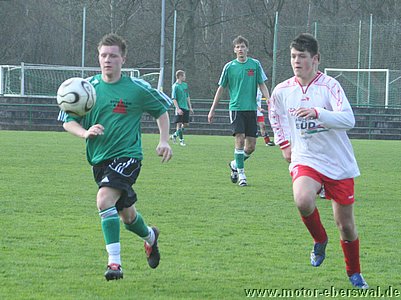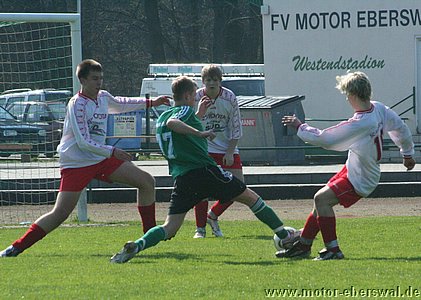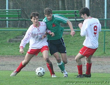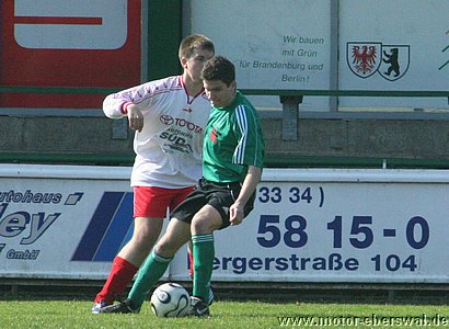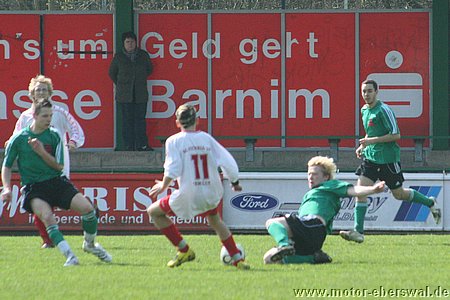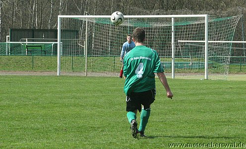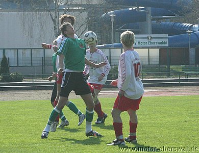 In einer von beginn an niveauarmen Partie war Motor zwar klar überlegen, konnte jedoch nicht überzeugen. Insgesamt gesehen mangelte es an der Durchschlagskraft im Angriffsspiel der Eberswalder. Dennoch gelang dem FV ein früher Führungstreffer, als Marz nach einem herrlichen Laufpass von Eichstädt traf – 1:0 (6.). In der Folgezeit lief nur wenig bei den Waldstädtern zusammen. Bis zum Sechzehner spielte Motor zwar ansehnlichen Fußball, doch dann mangelte es beim Torabschluss sowie den entscheidenden Finalpass. Die Gäste aus Templin versuchten mit einer offensiven Grundausrichtung nach vorne zu spielen, doch ähnlich wie bei den Hausherren wirkten die Angriffsbemühungen zu durchdacht, so dass die nicht einmal überragend spielende FV – Hintermannschaft jederzeit Herr der Lage war. Als Eichstädt im Templin – Strafraum gefoult wurde, entschied Schiedsrichter Duwe aus Finowfurt auf Foulelfmeter, den Martin Präger souverän zum 2:0 verwandelte (26.). Kurze Zeit später stand Präger erneut im Mittelpunkt, als er nach einem Eckstoß von Marz mit einem tollen Kopfstoß unhaltbar traf (32.). Dann erspielte sich Motor eine ganze Reihe an Torchancen, vergab diese jedoch zu leichtfertig, so dass es beim 3:0-Halbzeitstand blieb. Gleich nach Wideranpfiff schloss Eichstädt einen tollen Spielzug erfolgreich ab und erhöhte auf 4:0 (46.). Anschließend ebbte der Spielfluss der Barnimer stark ab, so dass die Zuschauer in den ersten zwanzig Minuten der zweiten Halbzeit, mit Ausnahme des Tores zum 4:0-Zwischenstand, Fußballerische Magerkost geboten bekamen. Mit einem Doppelschlag von Scharney und Klein innerhalb einer Minute schraubten die Hausherren das Ergebnis auf 6:0 (64. / 65.). In der Schlussphase gaben sich die Gäste aus Templin mehr und mehr auf und vernachlässigten die Deckungsarbeit stark, so dass Motor immer wieder freie Räume zum kombinieren besaß und durch Tore von Scharney, Marz und Klatt den 9:0-Endstand markierte (78. / 87. / 88.). Motor landete einen souverän heraus gespielten Sieg und verteidigte somit die Tabellenführung, wobei die Mannschaft noch etliche Reserven besitzt und das Leistungsvermögen noch absolut ausbaufähig ist.
