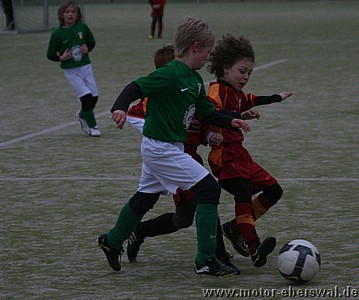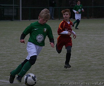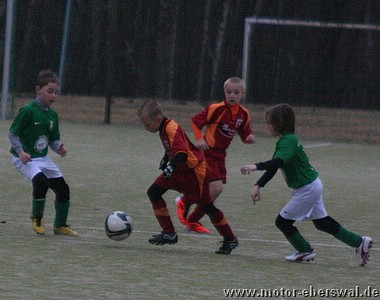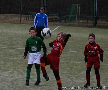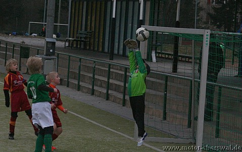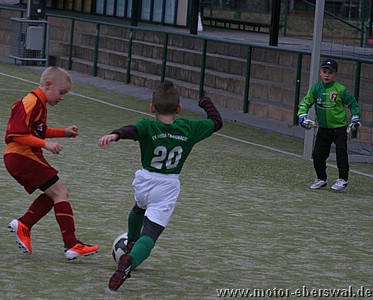 Im Stadtderby gewinnen die F-Junioren deutlich mit 3:0. Die Nachwuchsspiele des Wochenendes wurden wieder durch die F-Junioren eröffenet, das Team von Marcus Bülow und Sebastian Nähring war gegen Lok gleich von Beginn an spielbestimmend und verlagerte das Spiel in die Hälfte der Gäste. Nur mit der Verwertung der Chancen klappte es lange nicht. Der Torwart stand stehts genau richtig oder die Schüsse verfehlten das Tor knapp. Nur wenige Konter erreichten die Hälfte der Westender , auch dabei wurde meist unkonzentriert abgeschlossen. Die Führung dann durch einen Freistoss vom linken Strafraumeck , den Philip genau unter die Latte setzte. In der zweiten Halbzeit weitgehend das gleiche Bild, auch weil Lok seine Abschläge häufig über die Mittellinie schoss, kamen die Bälle immer schnell wieder an deren Strafraum zurück. Doch wurden die immer häufigeren Gelegenheiten stehts ausgelassen. So gab es nach einem Konter dann doch eine ernsthafte Ausgleichschance, bei der auch das Zusammenspiel zwischen Abwehr und Torwart nicht gut aussah. Der Ball ging jedoch haarscharf links vor bei. Danach war das Aufatmen groß, als nach einem abgefälschten Schuss von Moritz sich der Ball ins Tor senkte. Gleich mit dem nächsten Angriff wurde der Sack dann entgültig zu gemacht. Diesmal spielte Philip die Chance heraus und Niklas konnte unmittelbar vor der Torlinie abstauben. Auch wenn es im Spiel sicher Chancen für ein höheres Ergebnis gegeben hatte, gab es so doch einen deutlichen Erfolg, der Motor weiter in der Spitzengruppe der Liga mitmischen lässt.