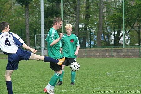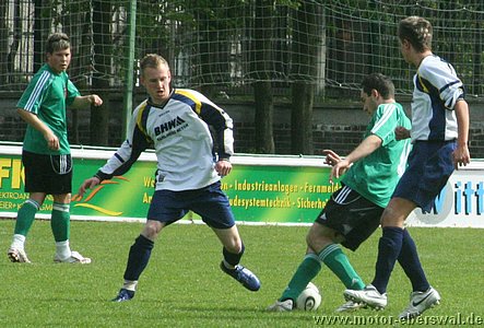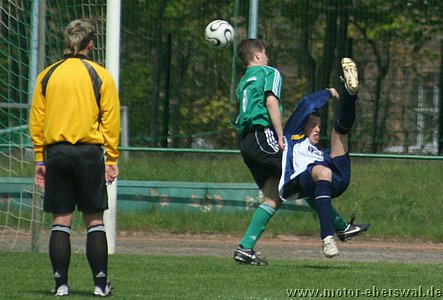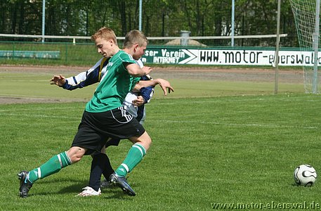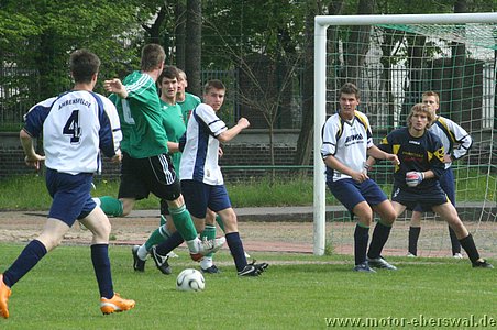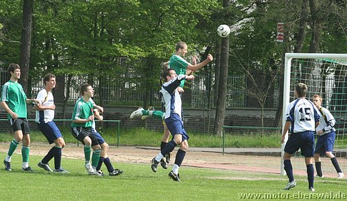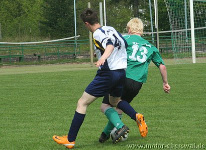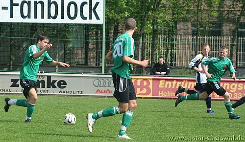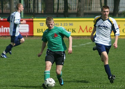 Ohne die 4 Stammspieler gewann die A-Jugend hoch gegen Grün-Weiss Ahrensfdelde und steuert die Aufstiegsspiele an. Das muntere Toreschiessen begann in der 4.Minute als Tobias Marz einen schnellen Spielzug zum 1:0 abschloss. In der 15.Minute versenkte Martin Präger einen Kopfball nach einer Ecke zun zweiten Treffer. Ahrensfelde, die zwischendurch eine der wenigen Torchancen hatten, die aber Motor Torwart Christian Litka halten konnte, mussten in der 23.Minute das dritte Gegentor durch Erik Klatt hinnehmen, der aus spitzem Winkel ein Alleingang abschloss. In der 33.Minute setzte Martin Präger einen Ball genau in den Dreiangel und noch in der gleichen Minute erhöhte Erik Klatt vom Anstoss weg auf 5:0. Dabei blieb es bis zur Pause, wobei Motor weitere Chancen besass und Ahrensfelde die Gegenwehr immer mehr einstellte. Das gleiche Bild auch in der zweiten Halbzeit. Das Spiel fast auf ein Tor. Ahrensfelde versuchte nur noch durch Befreiungsschläge ihre einzige Sturmspitze zu erreichen. Währenddessen standen sich die Motor Spieler im Strafraum teilweise selbst auf den Füssen, hundertprozentige Torchancen wurden durch Tobias Marz, Martin Präger und Arvid Maron mehrere vergeben. Erst in der 63.Minute erzielte Tobias Marz das 6:0 dann nahm das lustige Toreschiessen wieder fahrt auf. In der 65.Minute erzielte Erik Klein aus dem Gewühl das 7:0 und in der 75.Minute das 8:0 woraus er in der 87. Minute mit seinem Dritten Treffer sogar noch einen Hattrick machte. Ahrensfelde war in der vorletzten Minute doch noch erfolgreich, als Konrad Schulz, der die Ahrensfelder Sturmspitze bisher völlig im Griff hatte, von diesem ausgespielt wurde und im Alleingang den Ehrentreffer machte. Felix Scharney hatte danach die Chance das Ergebnis zweistellig zu machen, das gelang nicht mehr.