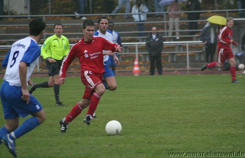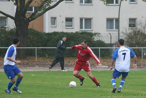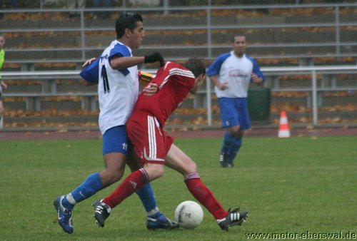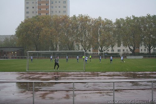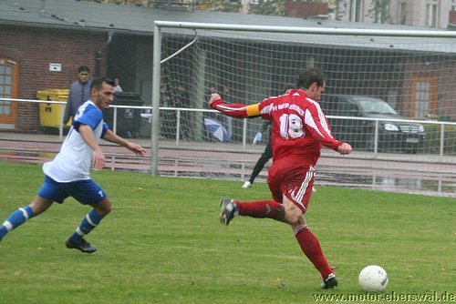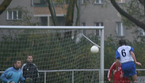 Ein durchgehender Nieselregen bei Windböen aus allen Richtungen hatten das Kreuzberger Katzbach stadion in ein rutschiges Rasenstück verwandelt. Ansich keine schlechten Bedingungen, so bremste das schwierige Geläuf die technischen Qulitäten der Hausherren einigermassen aus. Das Spiel zu Beginn verteilt und Motor mit ersten Akzenten nach vorne, auch wenn Thomas Döhring und Frank Ploen mit Gelegenheiten nicht zum Abschluss kamen. Aufregung nach zehn Minuten, als der Türkiyemspor Torwart einen langen Ball vor Rafet Ates mit den Händen abfing, sich dabei aber knapp zwei Meter vor dem Strafraum befand, kein Abwehrspieler in der Nähe. Nicht nur nach Ansicht des Motor Anhangs eine klare Rote Karte, der Schiedsrichter beliess es jedoch bei Gelb. Der Freitstoss, flach von Frank Ploen getreten zwang den Keeper dann zu einer starken Parade. Danch kam Türkiyemspor jedoch immer besser ins Spiel und hatte nach zwanzig Minuten zwei Großchancen, bei denen Olaf Pospieszny jedoch gut reagierte. Ein Freistoß von der Strafraumgrenze brachte dann jedoch den Rückstand. Der Ball, als Flanke getreten, rutschte regelrecht durch die Abwehr ins Tor. Kaum davon erholt, misslang Mirko Rücker eine Abwehraktion. Beim Versuch volley zu klären trat er über den flatternden Ball. Ein Türkiyem Stürmer lies sich das Geschenk nicht nehmen und verwandelte im Alleingang zum zweiten Treffer. Motor wurde nun völlig hinten rein gedrängt und hatte Glück zur Pause nicht sogar noch den dritten Gegentreffer zu bekommen. Nach der Pause versuchte es nocheinmal und erzielte durch Rafet Ates per Kopf tatsächlich ein Tor, das jedoch wegen Abseits nicht anerkannt wurde. Türkiyemspor, die den Vorsprung auch nur noch verwalteten gingen nun nicht mehr so konsequent zur Sache, allerdings war ihre Hintermannschaft Herr der Lage, auch weil Motor beim Spiel über mehrere Stationen immer wieder den Ball verlor. Einen verlorenen Zweikampf von Christian Stelse bestrafte dann ein aufmerksamer Stürmer der Kreuzberger mit dem dritten Treffer und nur wenig später nutzte selbst eine starke Retungsaktion von Olaf Pospieszny, Kristian Stelse und dem Innenpfosten nichts, den geklärten Ball konnten die Berliner nochmals nach innen Flanken, von wo er volley unter die Latte zum 4:0 verwandelt wurde. Tore die alleine durch krasse individuelle Fehler der Eberswalder entstanden waren und für die die Berliner wenig tun mussten. Als das Spiel nun entgültig entschieden war, konnte Motor sogar nochmal etwas zeigen. Christian Hintz und der eingewechselte Rico Musick zwangen den Türkiemspor Torwart zu Paraden und Frank Ploen gelang auf Vorlage von Christian Rauch noch ein Treffer, der zwar wenig am Ergebnis änderte, aber den, das Spielverlauf nach zu hohe Ergebnis noch etwas korregierte.