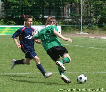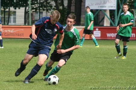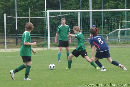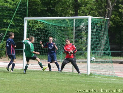 Die C-Junioren gewinnen gegen Altlandsberg mit 3:1 und behaupten den knappen Vorsprung vor Seelow. Entscheidend war im Spiel die Anfangsphase, in der eine starke Einzelaktion von Paul Schuster direkt zum 1:0 in der siebenten und das 2:0 ebenfalls nach Vorlage von Paul Schuster und Abschluss von Hannes Drews bereits nach 12 Minuten die Vorentscheidung brachten. Motor verlor danach zusehends den Schwung der Anfangsminuten, hatte den Gegner aber weitgehend im Griff so das bis zur Pause wenig in Gefahr zu geraten schien. Nick Lange und Eirik Fink hätten das Ergebnis noch ausbauen können. Gleich zu Beginn der zweiten Halbzeit hatte Altlandsberg dann die erste gefährliche Aktion nach einem Dribbling an der linken Grundlinie, welches mit einem Foul beendet wurde. Der Strafstoss brachte den Anschlusstreffer. Das Spiel danach ohne klare Linie, Motor zwar defensiv sicher stehend, aber in der Spitze zu unkonzentriert. Philip Puls und Paul Schuster hatten noch gute Gelegenheiten auf dem Fuß. Die Entscheidung dann aber erst zehn Minuten vor dem Ende, als Nick Lange nach einer Ecke von Paul Schuster den dritten Treffer markieren konnte. Eberswalde bleibt weiter ein zwei Punkte Vorsprung auf Seelow, es darf also bis zum Saisonende kein Ausrutscher passieren. Nächste Prüfung ist in Strausberg, das Spiel in der "Energie Arena" ist auf Mittwochabend (25.5.) vorverlegt worden.