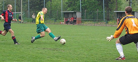 Diese Schwächung fiel zunächst nicht ins Gewicht, da die Platzherren nach Wiederanpfiff engagiert aufspielten und die Gäste unter Druck setzten. In dieser Phase kam der große Auftritt von Stürmer Robert Spiegelberg, der innerhalb einer Minute das Spiel zweimal hätte entscheiden können. In der 50. Minute wurde er glänzend frei gespielt und scheiterte am herauslaufenden Torwart (sh. Foto). Bei der anschließenden Ecke konnte er dann im Strafraum nur durch ein Foul gestoppt werden und der Schiri zeigte auf den Punkt. Entgegen der uralten Fußballweisheit, wonach der Gefoulte nicht schießen soll, schnappte er sich den Ball und scheiterte wiederum am Gästetorwart. Zu guter letzt zog er sich bei der nachfolgenden Ecke eine schmerzhafte Verletzung zu und musste nach 15 Minuten ausgewechselt werden.