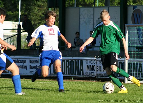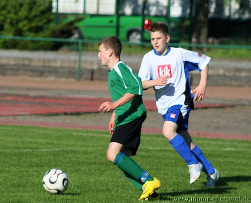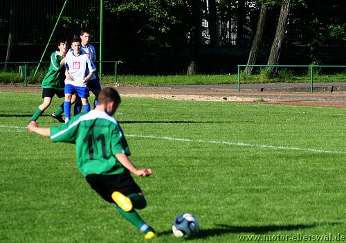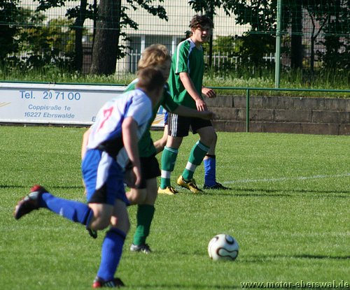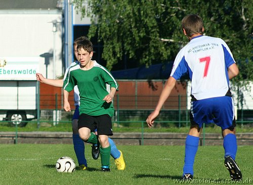 Die C-Jugend begann gegen Templin das Spiel sehr druckvoll und lauffreudig, versiebte aber viele Chancen weil zu kompliziert im Strafraum agiert wurde und weil den Schüssen der letzte Druck fehlte. Templin kam erst langsam zu Chancen , war immer schnell vor dem Tor und prüfte Marcus Landsrath zweimal ernsthaft. Nachdem Motor durch Nick Lange, Paul Schuster und Kenny Ladewig schon drei Großchancen vergeben hatte, nutzte Templin einen Patzer des Motor Keepers und staubte zur Führung ab. Doch Motor konnte sofort antworten, als Kenny Ladewig bei einem Dribbling im Strafraum gefoult wurde gab es Strafstoss, den der gefoulte sicher verwandelte. Im zweiten Abschnitt musste Motor den warmen Temperaturen zunehmend Tribut zollen. Die Aktionen hatten nicht mehr das Tempo und die Genauigkeit lies nach. Auch wurde oftmals der besser postierte Nebenmann nicht gesehen. Die mit langen Bällen operierenden Templiner hatten nun sogar mehr Chancen, scheiterten jedoch am eingewechselten Motor Keeper Julius Giebel, der in der Schlussphase einen Ball noch über den Dreiangel lenkte. Zwei Minuten vor dem Ende bekam Paul Schuster wegen Nachschlagens die Rote Karte, dennoch wäre Motor fast noch der Siegtreffer gelungen, als Kenny Ladewig ein Missverständnis zwischen Templiner Keeper und Abwehrspieler ausnutzte und frei vorm Tor war, aber noch gestört werden konnte. So musste Motor mit einem Punkt vorlieb nehmen.