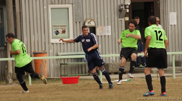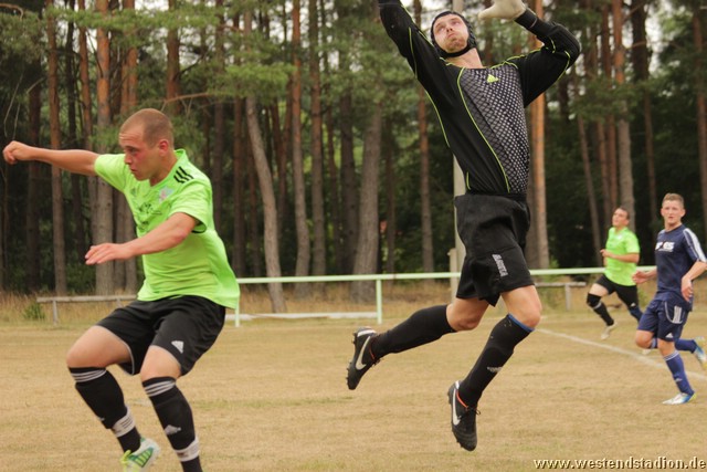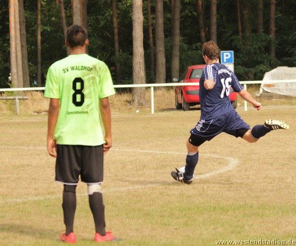 Auf einem völlig vertrockneten Rasen bei heißen Temperaturen, spielte man den sicheren Ball und wartete auf die Fehler, die der Gegner dann auch machte. Zunächst wurden einige Chancen durch Philipp Heinrich und Chris Zimmermann nicht genutzt, so dauerte es bis zur 23.Minute, ehe Kenny Ladewig einem quer gespielten Ball bis zur Auslinie nachsetzte und auf dem Rückweg seinen Bewacher stehen lies. Seinen Pass nutzte Chris Zimmermann auf zentraler Position freistehend um die Führung zu erzielen. Spechthausen setzte in der ersten Halbzeit zwei Konter, spielte aber jeweils den letzten Pass zu lang so das keine zwingende Chance dabei heraus kam. Das zweite Tor dann kurz vor der Pause, wieder von Kenny Ladewig eingeleitet. Sein Pass erreicht Philipp Heinrich, dieser ist nach einem Dribbling zentral durch, scheitert am Torwart. Aber der abprallende Ball wird von Paul Kallies dann zum zweiten Tor abgestaubt.