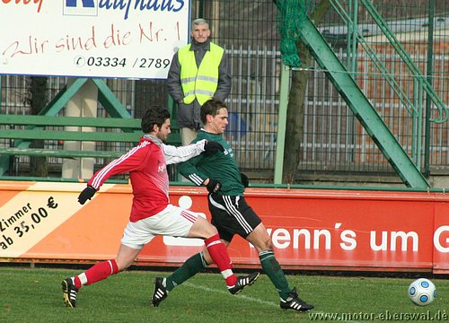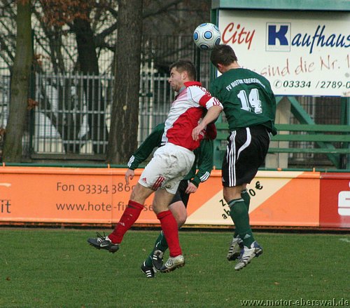 Motor gelingt trotz einiger personeller Ausfälle ein Heimsieg gegen Grün Weiß Lübben, in einem flotten Spiel entschied ein Tor von Eric Klein das Spiel. Von Beginn an gab es gute Chancen auf beiden Seiten. Marcel Urbanowicz verpasste knapp vor dem Tor eine Flanke von José Hornemann, auf der Gegenseite ging ein Fernschuss knapp am linken Pfosten vorbei. Beide Teams versuchten nach vorne zu spielen, wobei Motor in der ersten Halbzeit mehr Torchancen hatte, aber auch Lübben konnte sich zeitweise vor dem Tor der Eberswalder festsetzen, wobei Motor vor allem die Lufthoheit nutzte so gab es nur wenige klare Gelegenheiten. Die größte hatten die Gäste, als ein Stürmer vor dem Tor angeschossen wurde, der Ball wurde so aber knapp neben das Tor gelenkt, es wäre sonst unhaltbar gewesen. Motor hatte mit einem abgefälschten Freistoss von Steffen Sasse die größte Chance zur Führung vor der Pause, aber der Keeper reagierte noch auf der Linie und stoppte den Ball. In der zweiten Halbzeit ging es genauso weiter. Der eingewechselte Eric Klein fügte sich gut ins Angriffspiel ein und machte auf Pass von Christian Rauch über die rechte Seite im Alleingang die Führung. Lübben warf nun alles nach vorne und war bei Schüssen aus der zweiten Reihe gefährlich öffnete jedoch weite Konterräume. Eric Klein hatte seinen zweiten Treffer auf dem Fuß als er zentral frei durch war, aber unplatziert den Keeper anschoss. Ein anderes mal kam Marcel Urbanowicz nach einer Ecke mit dem Kopf freistehend nicht an den Ball. Lübben drückte in der Schlussphase nochmal nach vorne und hatte seine größte Gelegenheit nach einer Flanke von links köpfte ein Stürmer aus nächster Nähe am Tor vorbei. Die Schlussminuten zog sich Motor weiter zurück und gegen die dichter stehende Abwehr kamen die Lübbener nur selten zum Zuge, zumal auch bei ihnen die letzten Anspiele am Strafraum nicht ankamen und sie ihre Freistösse eher kläglich vergaben. Marcel Urbanowicz hätte zwei Minuten vor Schluss das Spiel entscheiden können, als der Torwart der Lübbener einen Fernschuss nicht festhielt. Aus fünf Metern ging der Abstauber jedoch links vorbei. Aber es reichte auch so zum zweiten Heimsieg der Saison, der allerdings mit zwei weiteren Gelbsperren für die letzte Partie der Hinrunde teuer erkauft ist.