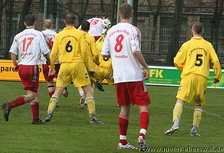 In einer abwechslungsreichen Begegnung, die viele Zweikämpfe zu bieten hatte, nahm die Partie sofort hohes Tempo auf, so dass den Zuschauern ein längeres Abtasten erspart blieb. Motor Eberswalde II spielte aus einer erneut kompakt agierenden Deckung heraus und erreichte somit eine leichte Spiel – und Feldüberlegenheit. Der Gast, der mit der klaren Zielstellung anreiste einen Auswärtssieg zu holen, um weiter im Aufstiegsrennen zu bleiben, zeigte sehenswertes Kurzpassspiel und versuchte immer wieder seine schnellen Stürmer in Schussposition zu bringen. Diese waren jedoch bei den starken Eberswalder Manndeckern Neumann und Gräfe weites gehend abgemeldet. Auch auf der anderen Seite bissen sich die Motor – Akteure die Zähne an der umsichtig agierenden Prenzlauer Defensive aus. Die größte Torchance im ersten Durchgang besaß Gordon Hahn, als er den Rot – Weiß Keeper zu einer Glanzparade zwang (32.). Da beide Abwehrreihen nur wenige Torraumszenen zuließen, ging es mit einem gerechten Remis in die Halbzeitpause. Im zweiten Durchgang war Prenzlau das aktivere Team und drängte Motor II in deren eigene Hälfte. Gefährlich wurde Prenzlau jedoch nur selten, da die gesamte Motor – Mannschaft ein starkes Stellungsspiel zeigte, die Räume eng machte und den Aufstiegskandidaten aus Prenzlau kaum zur Entfaltung kommen ließ. Motor II sorgte durch einen geordneten Spielaufbau von hinten heraus für Entlastung, so dass die leichte Dominanz der Uckermärker nicht unbedingt sichtbar wurde. In der Schlussphase drängten beide Teams auf das entscheidende Tor. Beiden Mannschaften war weiterhin der absolute Siegeswille anzumerken, es wurde hartnäckig um jeden Ball gekämpft und auch der läuferische Aufwand blieb auf hohem Niveau. Prenzlau vergab seine guten Tormöglichkeiten zu leichtfertig und Motor lauerte geduldig auf seine Torchance. Diese ergab sich unmittelbar vor Schluss, als Michael Prost hervorragend frei gespielt wurde und völlig freistehend vor FSV – Keeper Redmann auftauchte, jedoch scheiterte (88.). Somit blieb es beim Leistungsgerechten Unentschieden nach einer unterhaltsamen Partie, in der nur die hochkarätigen Chancen sowie die Tore fehlten.