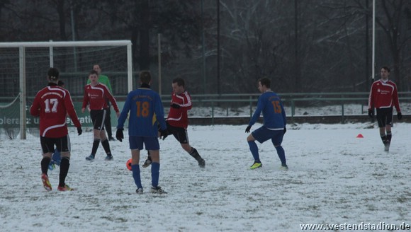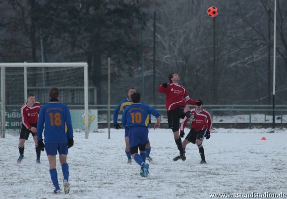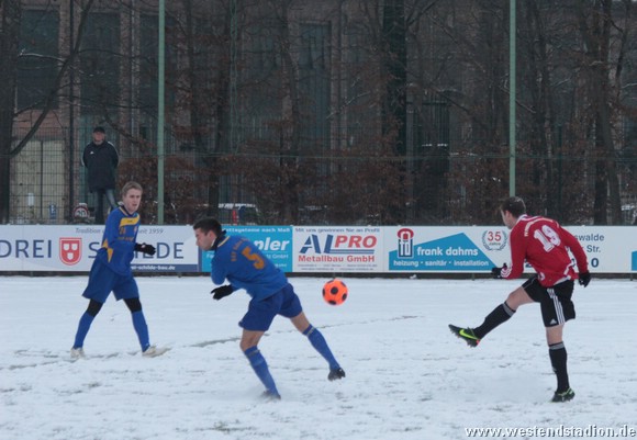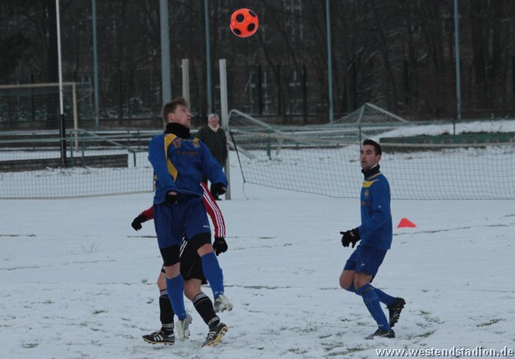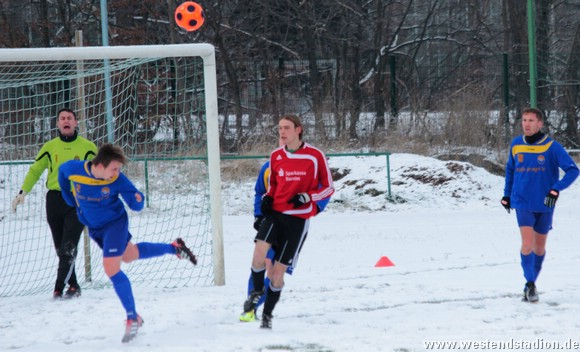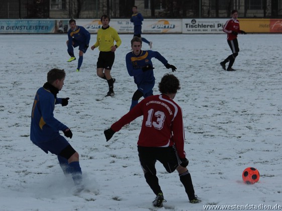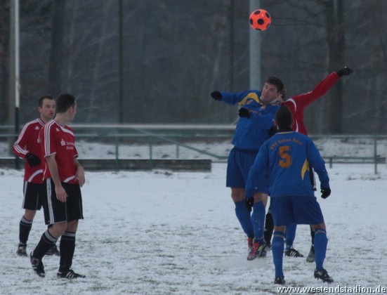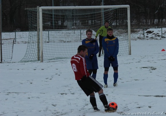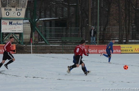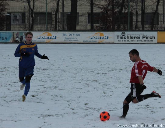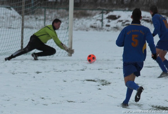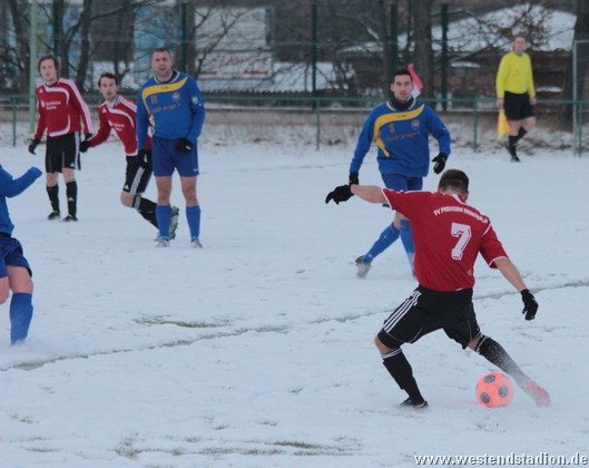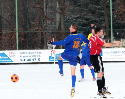 Das sah noch in der ersten Szene anders aus, denn da wäre dem Gegner fast die Führung gelungen. Ein langer Ball in die Spitze wird von einem Stürmer erreicht, der das Laufduell gegen Kristian Stelse gewinnt und zum Torschuss kommt, dieser geht aber vorbei. Spätestestens nach zehn Minuten hatte man sich an die Platzverhältnisse gewöhnt und den Gegner im Griff. Christian Schlegel ist schon alleine auf dem Weg zum Tor, als er nach einer Abwehraktion an der Strafraumgrenze zu Fall gebracht wird. Der Pfiff bleibt aus und der Gegner damit mächtig im Glück, denn den Ball hatte der Verteidiger nicht getroffen. Davon lies man sich aber nicht verunsichern und spielte weiter sein Spiel. Rico Eichstädt, der auf der linken Seite von Steffen Sasse in Szene gesetzt wird schliesst sein Solo mit einem gekonnten Schuss in die kurze Torecke zur Führung ab. Guben kommt danach kaum noch nach vorne, die Eberswalder kontrollieren das Spiel und haben mit einem Kopfball von Philipp Kühl die nächte Großchance, diesmal pariert der Torwart aber ganz stark. Die Gäste bekommen zwar einige Freistösse können daraus aber nichts machen, die Kugel kommt immer wieder schnell zurück, so wird ein Konter mit drei gegen zwei gefahren, wobei Christian Schlegel allerdings den Abschluss zu lange verzögert und Christian Rauch den abgelegten Ball zu unplatziert trifft. Noch kurz vor der Pause liegt wieder der zweite Treffer in der Luft, als Marcel Hellmich mit einem Schuss auf acht Metern am erneut stark parierenden Keeper scheitert. Die zweite Hälfte beginnt gleich mit dem vorentscheidenden zweiten Treffer. Beim ersten Angriff nutzt Christian Rauch einen langen Ball, der im Schnee noch abstoppt und kann den Keeper mit einem Flachschuss überwinden. Guben kann danach nur wenige Aktionen aus seiner Hälfte herausbringen und das ohne eine zwingende Gelegenheit zu haben. Die Preussen können sich auf schnelle Konteraktionen einstellen. Rico Musick setzt sich nach Doppelpass mit Christian Schlegel am linken Strafraumeck durch und umkurvt den Keeper, sein Schuss aus spitzem Winkel wird in letzteer Sekunde von einem reinrutschenden Verteidiger vor der Linie weggekratzt. Der zur Pause eingewechselte Eric Brien ist über die rechte Seite frei durch und macht mit einem Schuss in die lange Ecke das dritte Tor. Die Gubener wehren sich danach kaum noch und machen es den Preussen nun sehr leicht. Christian Schlegel kann eine Ecke von Steffen Sasse von der rechten Seite völlig unbedrängt einköpfen. In der letzten Minute war dann wieder Eric Brien auf der rechten Seite durch, sein Pass von der Grundline wird am Fünfmeterraum von Sebastian Schmidt erwischt, der mit dem fünften Tor den Schlusspunkt setzt. Obwohl das Spiel wegen des Wetters auf der Kippe zu stehen schien, konnte doch eine temporeiche und stellenweise sogar spielerisch gut anzusehende Partie runtergespielt werden. Für die Eberswalder vielleicht schade das durch die Winterpause die starke Serie der letzten Spiele erstmal unterbrochen wird, den Schwung gilt es in der Rückrunde wieder aufzunehmen.
