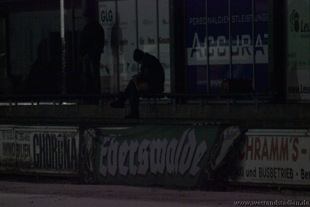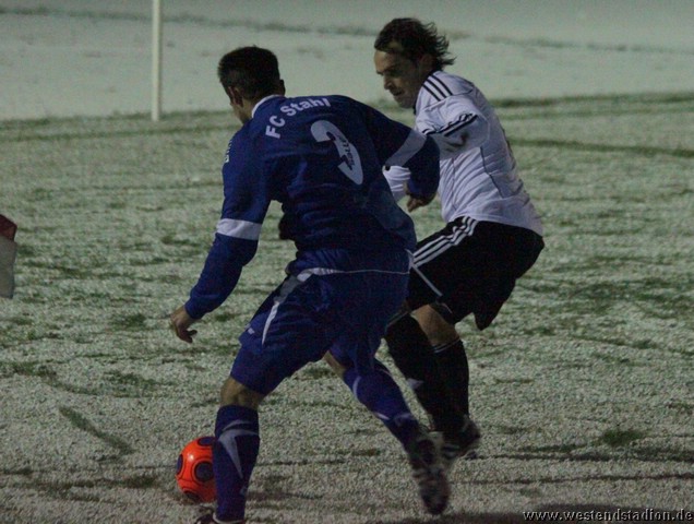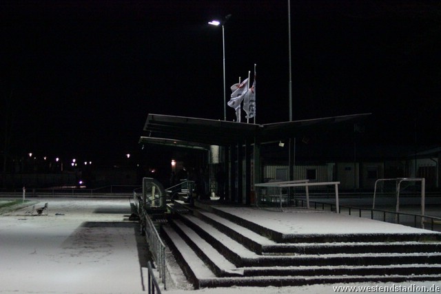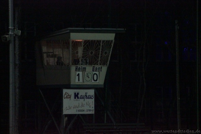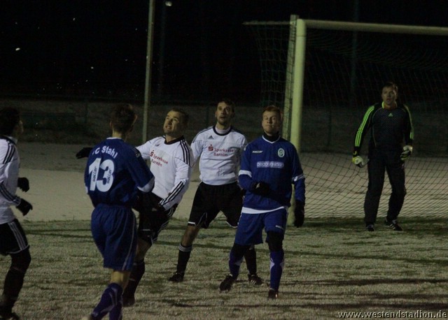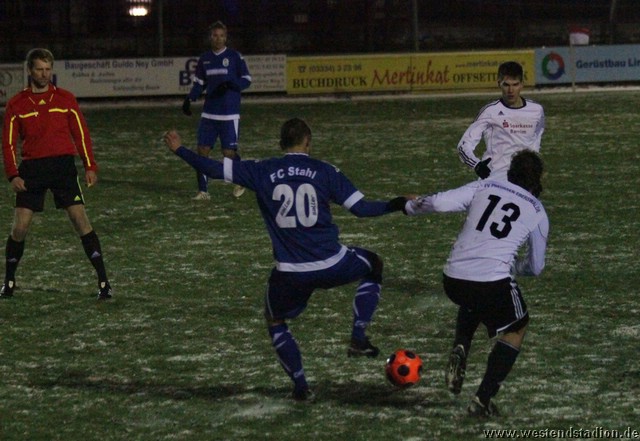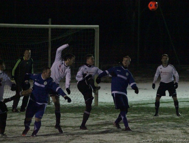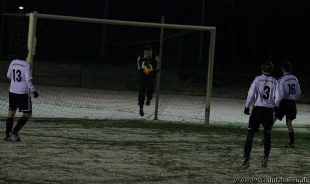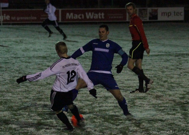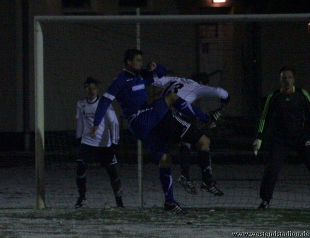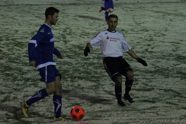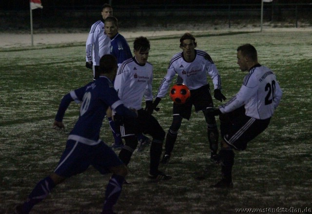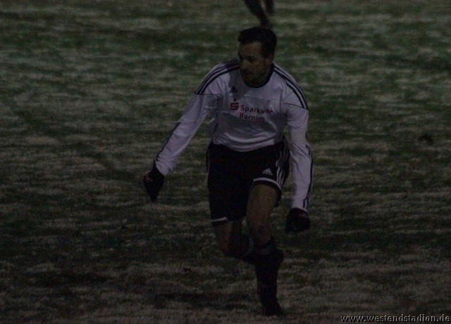 Schnee, Temperatur die langsam unter Null sinkt und dazu stürmischer Wind, man kann sich bessere äußere Umstände wünschen, aber Wünsch-Dir-Was war es nicht. Preussen zwar in den Zweikämpfen deutlich besser und auch gegen die Windrichtung in der ersten Halbzeit mit mehr Szenen in der Offensive, allerdings immer wieder im letzten Moment mit einem Querpass der dann doch geklärt werden kann. In der 10. Minute kann Rico Musick eine Flanke vors Tor schlagen, Felix Kalohn trifft den Kopfball nicht optimal und der Ball rutscht vorbei. Steven Zimmermann hat drei Minuten später einen Konter, macht aber am Strafraum einen Haken und schiesst dann vorbei. Erik Meschter hat in der 22. Minute schon die Führung auf dem Fuß, die Hereingabe von Steffen Sasse wird von einem Brandenburger verpasst und der Preussen Stürmer hat das freie Tor vor sich, legt sich aber den Ball noch mal auf den anderen Fuß, so ist der Verteidiger wieder da und stört entscheident. Brandenburg nur mit zwei Freistössen mal in Tornähe, aber ohne richtige Gefahr. In der 29.Minute nimmt Steven Zimmermann eine Freistossflanke von Steffen Sasse am Strafraum an und zieht nach Drehung aufs Tor ab. Der Keeper ist zwar zur Stelle, lässt den Ball aber über die Schulter ins Tor abtropfen. Bis zur Pause hat Preussen das Spiel dann völlig im Griff, auch wenn keine weiteren zwingenden Chancen zu verzeichnen waren. Nach der Pause hatte man den Wind im Rücken, was die Sache eigentlich erleichtern sollte. Aber Brandenburg machte nun deutlich mehr und so stand man zunächst hinten drin und erwehrte sich der Angriffe der Gäste. Die dribbelten zwar mehrmal gefährlich im Strafraum, hatten aber im Abschluss ebenso mit der Standfestigkeit auf dem rutschigen Boden zu tun, so das Kristian Stelse und Nil Naujoks jeweils den Ball noch rechtzeitig klären konnten. Wie zu erwarten ergaben sich bei aufgerücktem Gegner auch die Konterchancen. Allerdings tappte man dabei mehrfach entweder ins Abseits oder machte die winduntertützten Bälle zu lang. So waren die einzigen Bälle die aufs Tor kamen doch wieder Distanzschüsse, diese gingen aber auf beiden Seiten jeweils am Tor vorbei, ebenso wie ein Freistoss von Nils Naujoks in der 72.Minute. Die Entscheidung dann in der 81.Minute, nach einem Einwurf an der rechten Außenlinie zieht Rico Musick in den Strafraum und spielt zentral auf Steven Zimmermann, dieser schiebt den Ball zwar Torwart vorbei, der Ball wird aber von einem Verteidiger noch mal raus geschlagen, allerdings ganau vor die Füße von Marcel Hellmich, der zielt besser und schiebt den Ball in die linke untere Torecke ein. Damit war das Spiel praktisch gelaufen, auch wenn Brandenburg noch mal anrannte und einen halbhohen Schuss , der wohl eigentlich als Flanke gedacht war ganz knapp links neben das Tor setzte. Weiter passierte aber nichts mehr und der erste Dreier im Westendstadion in dieser Saison war perfekt und zu den Anstiegsplätzen ist erst mal wieder etwas Abstand.