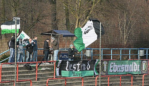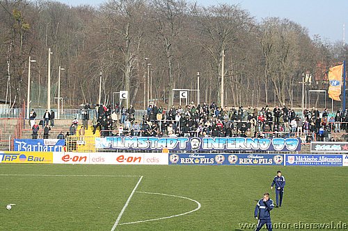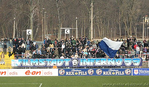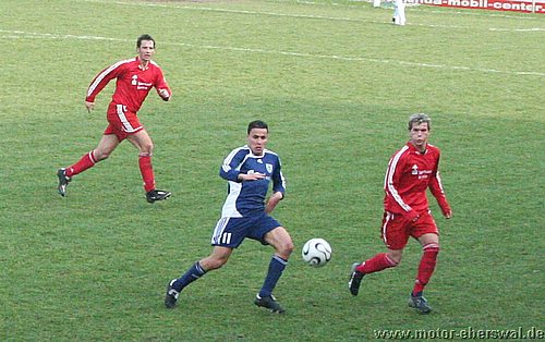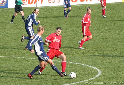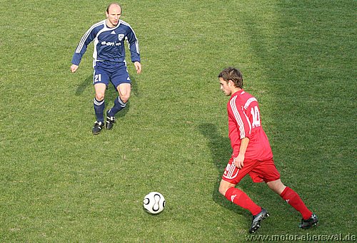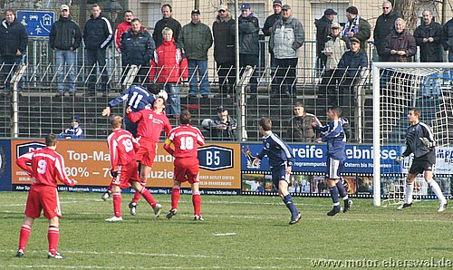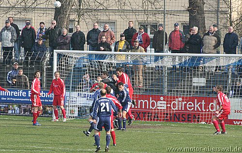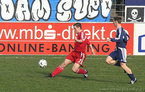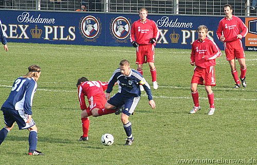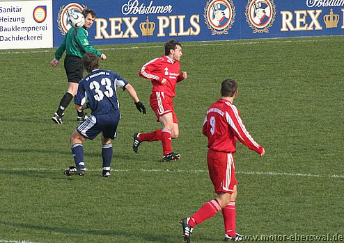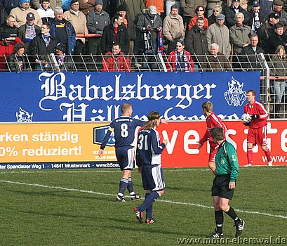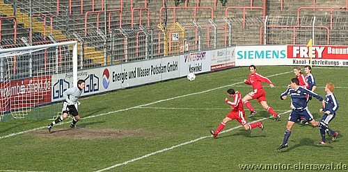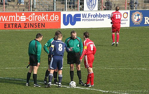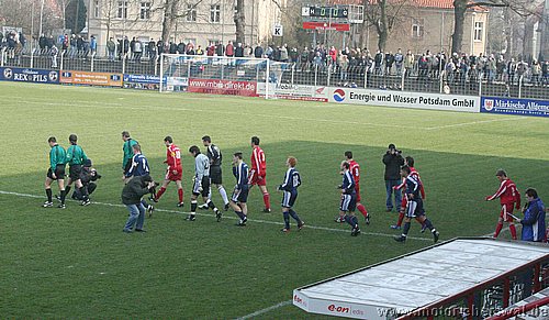 Dabei begann das Spiel wie erwartet, Motor stand sehr tief und lies Babelsberg kommen, die zwar ihr Spiel aufzogen, sich am Strafraum aber festliefen. Beim ersten Vorstoß in die Babelsberger Hälfte gab es nach einem Schupser gegen Frank Ploen einen Freistoß von der halblinken Position. Da sich die Bebelsberger Verteidiger auf die einlaufenden langen Motor Spieler Rücker und Kalohn konzentrierten stand Rafet Ates völlig frei und köpfte zum 1:0 ein. Der Tabellenführer konnte das Spiel jedoch im Gegenzug ausgleichen, ebenfalls nach einem Freistoß von links sah die Motor Abwehr ganz schlecht aus. Denn Mutschler stand nach einem Pass, der als Flanke angetäuscht war völlig frei am Sechszehner und erzielte den Ausgleich. Babelsberg nun klar spielbestimmend, kam allerdings eine halbe Stunde lang zu keinerlei zwingenden Chancen, während Motor, begünstigt durch starken Rückenwind immer wieder Entlastungsangriffe fahren konnte. Motor verlor nach einem Zweikampf im Mittelfeld 'Ente' Neumann, der mit Verdacht auf Bänderriss ausscheiden musste. Die beiden besten Chancen der Babelsberger waren noch Distanzschüsse die über den Kasten von Oberliga Debutant Adrian Peters gingen. In der vierziegsten Minute war dann unverhofft sogar die erneute Führung für Motor drin, nach einer flachen Ecke lies Rafet Ates im Strafraum für Steffen Sasse durch, seinen Schuss fälschte ein Babelsberger knapp neben den Pfosten ab (gab allerdings keine weitere Ecke). Zur Pause stand es nicht unverdient Remis, der Vorteil der Babelsberger war es in der zweiten Hälfte, das sie nun den Wind im Rücken hatten. So konnten sie vor allem die hoch geklärten Bälle immer wieder schnell zurückspielen, da sie regelrecht in der Luft stehen blieben. So herrschte eine gute halbe Stunde Belagerungszustand rund um den Motor Starfraum, wobei sich Babelsberg jedoch ebenso Abschlußschwach zeigte. Hinten agierte die kaum noch geforderte Abehr der Postdamer jedoch auch sehr lässig hätte in der 63.Minute bestraft werden müssen. So erkämpfte Johannes Pesecke einen Ball am Sechzehner und Frank Ploen stand völlig frei vorm Tor, schoss jedoch genau auf den Keeper. Im Gegenzug erzielte Babelsberg dann einen Treffer der wegen Abseits nicht gegeben wurde. Weiterhin schlug Babelsberg hohe Bälle in den Strafraum, die vor allem Kritian Stelse immer wieder per Kopf klärte. Bei einer Ecke von der linken Seite war es dann aber doch soweit, ein Kopfball aus fünf Metern ging gegen die Querlatte und zwei Babelsberger stocherten den Ball zur Line wo sich Adrian Peters auf den Ball warf, der jedoch lt. Linienrichter schon drüber war. Nun war Motor gezwungen offener zu spielen und Babelsberg trug die ersten schnellen Angriffe vor. So stoppte Adrian Peters einen Alleingang von Ben-Hatira mit dem Kopf, bei einem weiteren Eins-gegen-Eins war er mit einer Fußabwehr zur Stelle, hätte jedoch hinterhergucken müssen, als Tretschok einen Schuss aus Sechszehnmetern an den Pfosten schoss. Motor immer nur nach Lässigkeiten der Babelsberger Abwehr gefährlich, wenn dann aber richtig. So war Christian Schlegel plötzlich frei durch, verstolperte jedoch den Abschluss zu einem Schüßchen, das den Keeper nicht forderte. In der Schlussphase dann viel Hektik. Zunächst quottierten Babelsberger Zuschauer einige Ballverluste ihrer Mannschaft mit Pfiffen, auch weil Babelsberg nun mit dem knappen Ergebnis zufrieden schien. Eine Minute vor dem Ende gab es nochmal Freistoss am Babelsberger Strafraum, den Christian Schlegel in die Mauer schoss. Beim Nachsetzen hielt Ferry Manteufel bei einem langen Schlag des Babelsbergers Rudolph drüber und sah für das Foul die rote Karte, Babelsberg hatte Glück, denn der Torwart der Potsdamer rannte 30 Meter über den Platz um den Motorspieler zu schupsen. Bei einem anderen Schiedsrichter hätten sie das Spiel mit einem Feldspieler auf der Linie (3x gewechselt) beenden müssen. So kommt Motor mit einen sicher ordentlichen Ergebnis aus Potsdam zurück, vor allem in dem Wissen sich dort schon mal wesentlich schlechter angestellt zu haben.