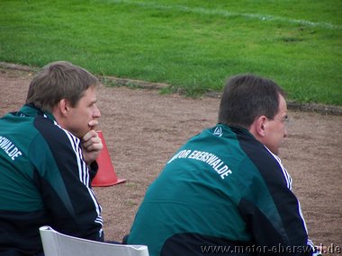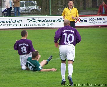 Völlig chancenlos unterlag Motor auf eigenem Platz auch Tennis Borussia Berlin, wobei die Niederlage den klaren Torchancen nach eher noch zu gering ausfiel. Nachdem man in der ersten Phase des Spiels einigermassen dagegen halten konnte, brachte ein unglücklicher Zusammenprall zwischen Jan Lorenz und einem TeBe-Spieler Motor erstmals aus dem Konzept. Während der Motor Spieler längere Zeit außerhalb des Spielfeldes behandelt (dann doch ausgewechselt) wurde, nutze dies Tebe Spieler Vuckovic, den am Strafraum drei Verteidiger nicht stoppen konnten zur Führung. Diese hätte Mansour wenige Minuten später ausbauen können, aber ein Heber aus 16 Metern ging gegen die Unterkante der Latte. Auch danach machte TeBe mit einer völlig in die eigenen Hälfte gedrängten Eberswalder Mannschaft was sie wollten, so ging ein Kopfball Millimeter übers Lattenkreuz und ein Fernschuss, nach einem Ballverlust in der Vorwärtsbewegung scharf rechts am Tor vorbei. Das 0:2 deutete sich so immer mehr an und fiel als sich ein Kopfball in die linke Torecke senkte, nach einer halben Stunde. Das Spiel wirkte zu diesem Zeitpunkt schon entschieden, zumal TeBe weiter nach vorne spielte und Motor sich nicht einmal ansatzweise dem Tor der Berliner näherte. Das 0:3 unmittelbar vor der Pause, erneut durch Vuckovic, diesmal nach einer Kombination mit Kadow spiegelte die Unterlegenheit von Motor deutlich wieder. Erst zu Beginn der zweiten Hälfte wehrte sich Motor wenigstens gegen die Höhe der feststehenden Niederlage, als nach einer Ecke Felix Kalohn über das Tor köpfte, dann Rafet Ates zweimal in guter Schussposition auftauchte, leider beide mal am Keeper scheiterte und Mathias Schilling einige gute Strafraumszenen hatte. In einer Szene schien ein TeBe Verteidiger den Ball vor Mathias Schilling mit der Hand gespielt zu haben, der Elfmeterpfiff blieb aber aus. Das Tebe jedoch nur eine Atempuase eingelegt hatte zeigte ihr erster Konter in der zweiten Hälfte, der nach einem Spielzug über 4 Stationen beim völlig freigespielten Griesert landete, der den vierten Treffer erzielte. Danach taten beide Mannschaften nicht mehr viel für die Offensive, Torschüsse resultierten lediglich aus zufälligen Situationen und waren nicht zwingend. Am Ende ersparten eher die Temperaturen und deshalb das Spiel mit angezogener Handbremse seitens der Berliner einer höhere Niederlage.