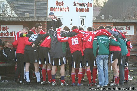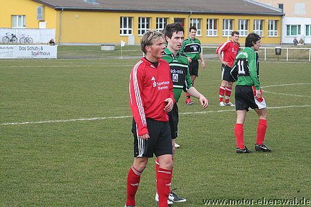 Die Anfangsphase des Spiel gehörte den Hausherren, die unterstützt von böhigem Wind mit langen Flanken zu Kopfballchancen kamen. Eine Parade von Markus Haase und viel Glück bei einem verpassten Ball am langen Pfosten verhinderten den frühen Rückstand. Motor brauchte mindestens 20 Minuten bis man richtig im Spiel war, kam dann aber vor allem über die linke Seite mit Ferry Manteufel und Christian Rauch zum Spiel nach vorne, wo aber Motor Stürmer Johannes Persecke immer wieder ins Abseits tappte. Die größte Chance für Neustadt dann nach einem Eckball, dem Kopfball schaute die Abwehr schon hinterher, ging aber knapp am Tor vorbei. Motor dann unverhofft in der 40.Minute mit dem ersten zwingenden Konter. Christian Rauch steckte auf Ferry Manteufel durch, doch dessen Abschluss alleine vorm Torwart war eher schwach und auch der Nachschuss endete als Flanke geschlagen im Nichts. Zur Pause wurde der längere Zeit verletzt ausgefallene Christian Schlegel eingesetzt und setzte als zweite Spitze sogleich Akzente. Über die linke Seite spielt er an zwei Abwehrspielern vorbei und legte auf Christian Rauch auf, dessen Schuss aber nicht platziert genug war. Anders nur eine Minute später, der nächste Konter über Christian Schlegel und Mathias Manteufel wurde von der Abwehr der Neustädter herausgeschlagen, doch Joahnnes Persecke traf mit einem Fernschuss zur Führung ins Toreck. Neustadt stürmte sofort nach vorne und fing sich drei Minuten später den nächsten Konter, diesmal hatte Johannes Persecke aufgepasst und war den auf Abseits spielenden Verteidigern um fünf Metern enteilt. Völlig frei vorm Keeper bleib er beim Versuch diesen zu umspielen hängen. Neustadt, die sich im Mittelfeld nun früh festliefen, hätten in dieser Phase ausgekontert werden können, konnten sich aber bei der schwachen Chancenverwertung der Eberswalder bedanken, das sie im Spiel blieben. Johannes Persecke, in der 72.Minute wieder frei durch schoss diesmal neben das Tor. In der 75.Minute übersah Sirko Neumann den eingewechselten Thoralf Krause und schloss mit einem Fernschuss ab. In der 81.Minute war dann Steffen Sasse eben so durch, scheitert aber ebenfalls am Keeper. Neustadt, die weit aufrückten versuchten es immer wieder mit langen hohen Bällen, die jedoch nach einer Umstellung in der Motor Abwehr längst nicht mehr so gefährlich waren wie zu Spielbeginn, so das Felix Kalohn und Kristian Stelse alles weggköpfen konnten. Lediglich in der 83.Minute stellte sich die Motor Abwehr zu umständlich an, als nach einer abgefangenen Flanke der Ball im Strafraum quer gespielt wurde schalteten die Neustädter nicht schnell genug so das Markus Haase zur Stelle war. In der Schlussphase immer größere Härte ins Spiel, der der Schiedsrichter, der in der ersten Halbzeit für Meckereien und Kleinigkeiten noch 6 gelbe Karten verteilt hatte, nicht Herr wurde. In der, durch zwei Behandlungspausen (Ferry Manteufel verletzt) reichlichen Nachspielzeit, hatte Neustadt noch zwei Freistösse aus aussichtsreicher Position. Schoss jedoch einmal daneben, das andere mal bleib der Ball an der Mauer hängen. Thoralf Krause wurde bei einem Entlastungsangriff von einem hohen Bein im Gesicht getroffen, revanchierte sich aber bei nächster Gelegenheit mit einer Tätlichkeit und sah die rote Karte, sein Gegenüber die Gelbe allerdings zum zweiten Mal und musste so auch vom Platz. Ihnen folgten nach wenigen Sekunden beide Mannschaften, denn der Auswärtssieg war über die Zeit gebracht und am Ende eigentlicher knapper als nötig ausgefallen.