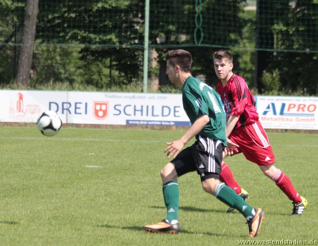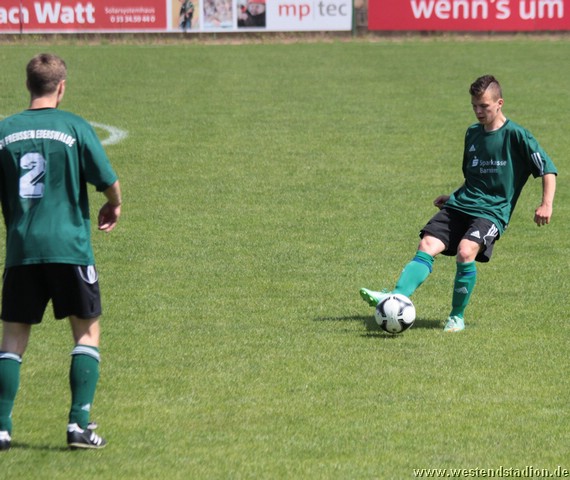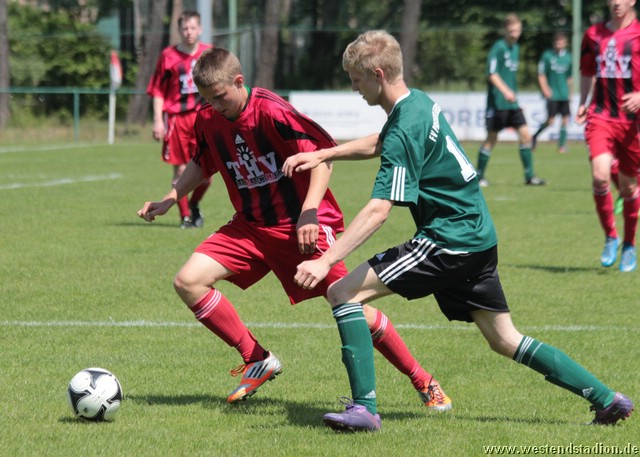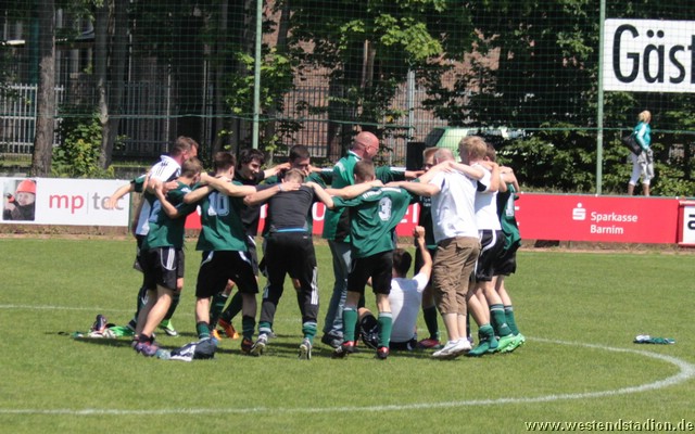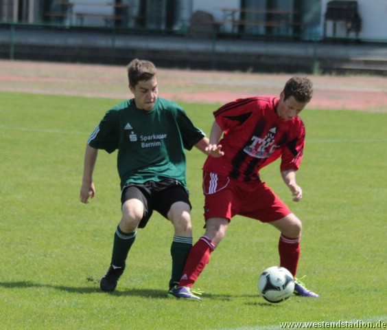 Dabei übertraf man sich in der ersten Halbzeit im Auslassen von Chancen. Kenny Ladewig, Nick Lange und Marius Aplas htten die Führung auf dem Fuß, schossen aber aus nächster Tornähe vorbei oder auf den Keeper. Diese fiel dann erst kurz vor der Pause nach einer Ecke von Nick Lange. Domenick Adam köpft Richtung Tor, wo ein Schwedter den Ball unhaltbar verlängert. Auch in der zweiten Hälfte war man spielbestimmend, doch in der Abwehr nicht mehr so sicher. So hatten auch die Gäste mehrere Torchancen, die aber nicht allzu zwingend waren. Erst die Schlussphase dann turbulent. Zunächst macht der eingewechselte Paul Schuster nach einem Solo mit einem Schuss in die kurze Torecke das 2-0. Diese hält aber nur fünf Minuten, als Schwedt mit einem flachen Fernschuss trifft und wieder im Spiel ist. So fällt die Vorentscheidung erst in der Vorletzten Minute, als erneut Paul Schuster mit einem Flankenlauf vorbereitet und Lennart Keller mit einem Heber auf 7 Metern trifft. Den Schlusspunkt markiert Raif Windiks mit einem Konter in der Nachspielzeit. Preussen liegt vor dem letzten Spiel mit besserer Tordifferenz, zwei Punkte hinter Petershagen. Muss also auf mindestens ein Unentschieden von Petershagen gegen Hennigsdorf hoffen und selber in Gransee gewinnen. Aus Wettbewerbsgründen wird das Spiel in Gransee zeitgleich (14.Jun 2014, 13:30 Uhr) angesetzt.