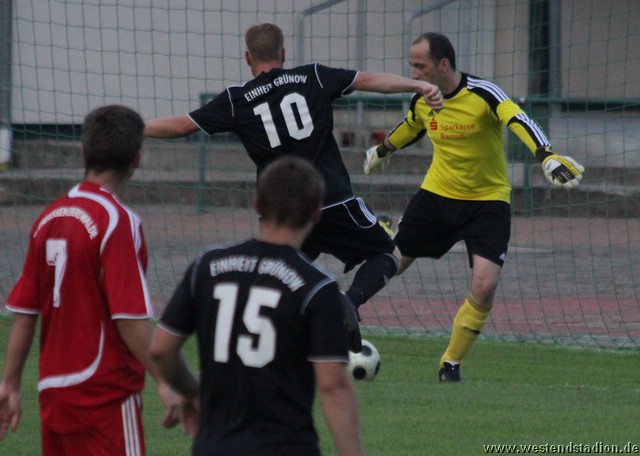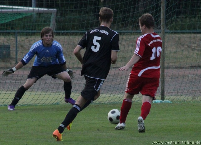 In der sechsten Minute bringt Christian Schlegel den Ball in den Strafraum, dieser kann vor Tobias Koepnick geklärt werden, kommt aber zu Christian Schlegel zurück, der bedient Erik Wohlgemuth und der macht die Führung aus fünf Metern. Der zweite Treffer nach einem ziemlich ungeschickten Foul vor der Grundline an Christian Schlegel, dieser verwandelt den Strafstoss selber. Danach noch Chancen zu Hauf, der Gegner versucht zu Kontern hat aber läuferisch kaum eine Chance gegen die Innenverteidigung der Preussen. Diese hadern nur mit der Chancenverwertung, aber unmittelbar vor der Pause doch noch der dritte Treffer, Tobias Koepnick nutzt eine Vorlage von Christian Schlegel um aus der Drehung am Fünfmeterraum zu vollenden. In der zweiten Halbzeit das gleiche Bild, Grünow nur auf Schadensbegrenzung aus, steht massiert vor dem Strafraum und macht dort den Raum eng. Der Grünower Torwart kann sich mehrfach auszeichnen, hat aber auch Glück. Allerdings ist er gegen einen Volleyschuss von Tobias Koepnick machtlos der eine Flanke von Steffen Sasse erläuft und mit Hilfe des Innenpfostens den Ball unterbringt. Seinen dritten Treffer des Tages macht der Neuzugang dann sechs Minuten später mit einem Gewaltschuss von der Strafraumgrenze. Auch danach haben Christian Schlegel und Marcus Bülow noch mehrere große Gelegenheiten, es blieb aber beim auch so deutlichen Ergebnis.